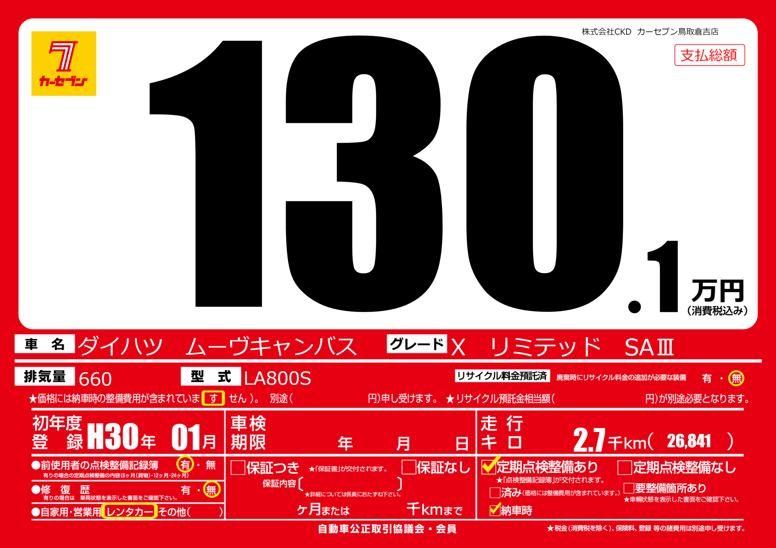 | 定期点検整備 | 定期点検整備あり 納車時あり | ||