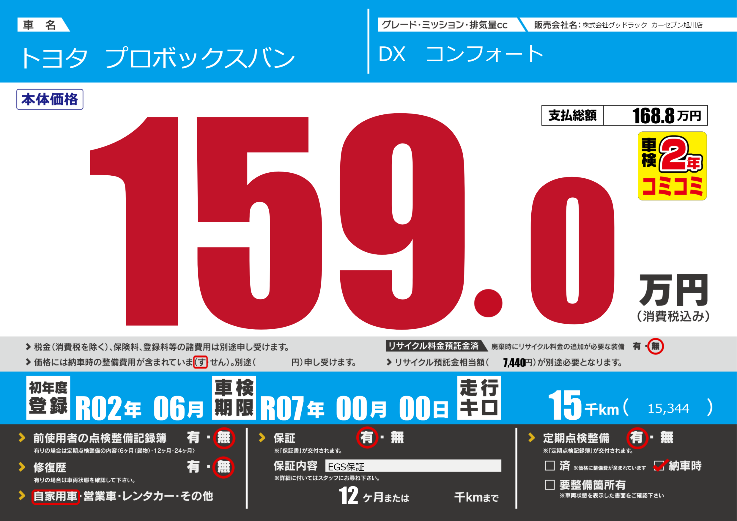 | 車名 | トヨタ プロボックスバン | グレード ミッション 排気量 |