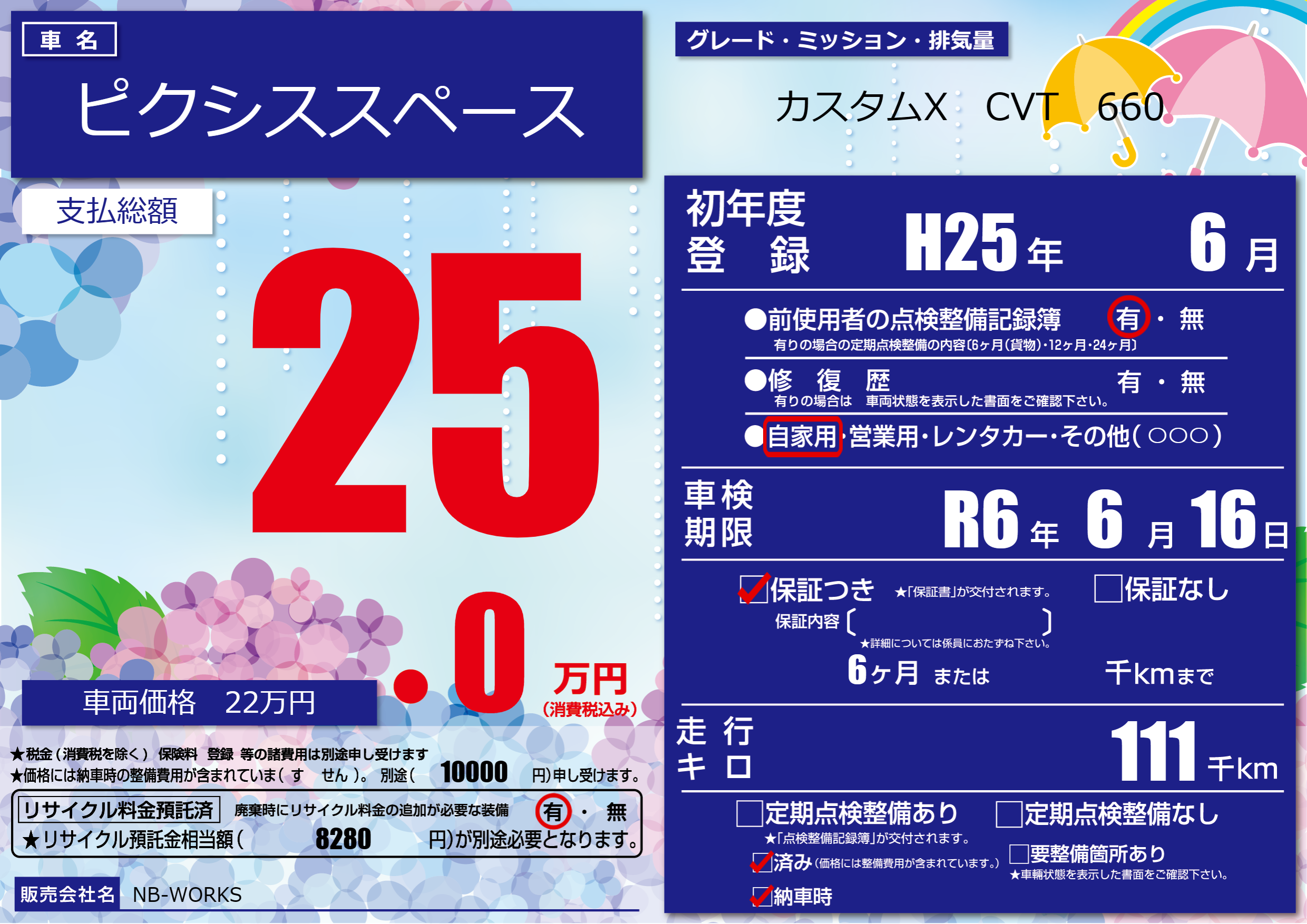 | 走行キロ | 11.1万km | 初年度登録 | H25年6月 |