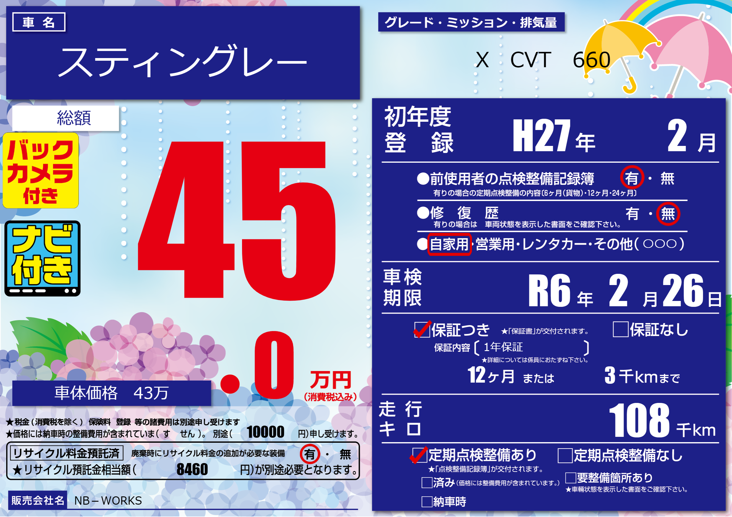 | 車名 | スティングレー | グレード ミッション 排気量 |