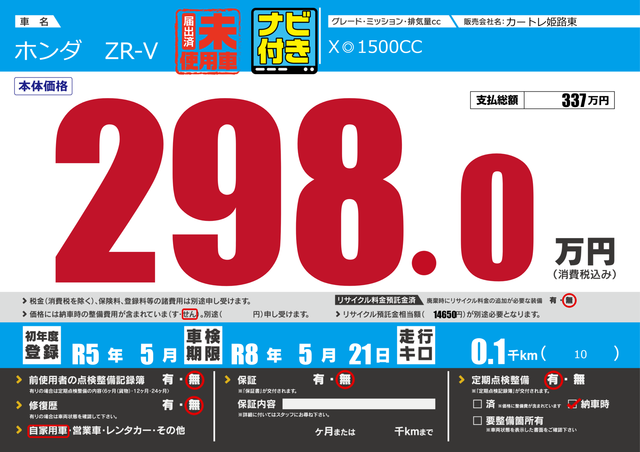 | 車名 | ホンダ ZR-V | グレード ミッション 排気量 |