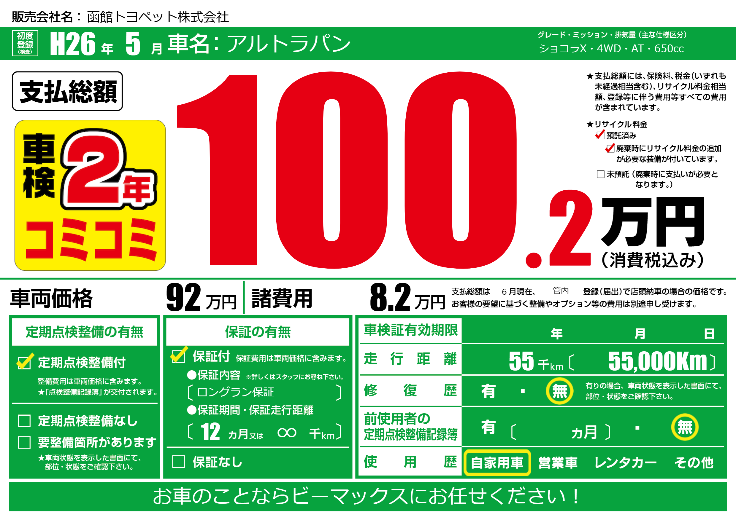 | 走行キロ | 5.5万km | 初年度登録 | H26年5月 |