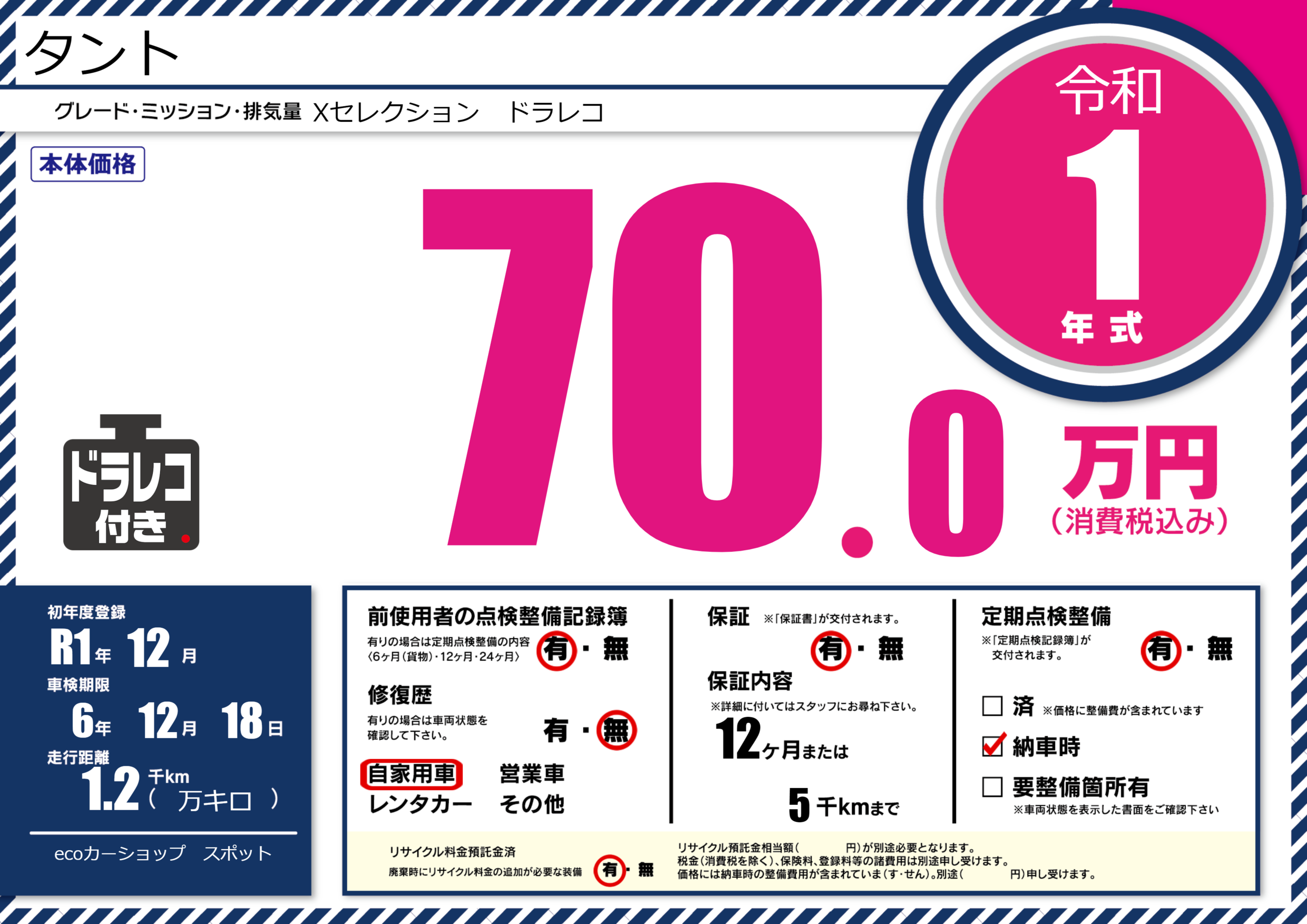 | 走行キロ | 0.1万km | 初年度登録 | R1年12月 |