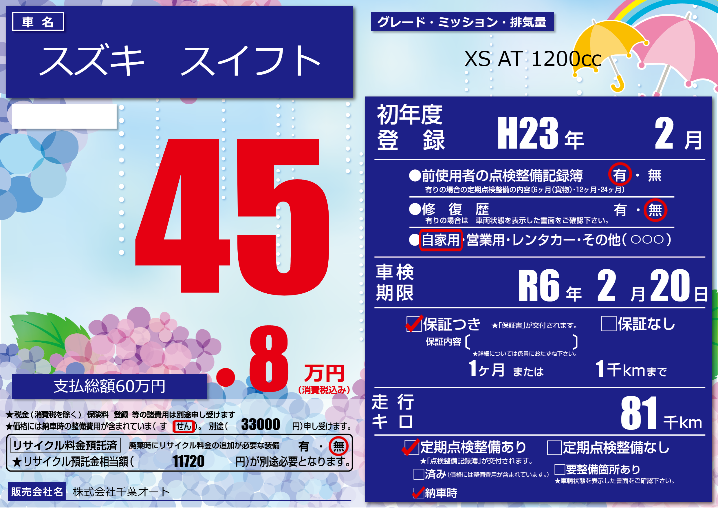 | 車名 | スズキ スイフト | グレード ミッション 排気量 |