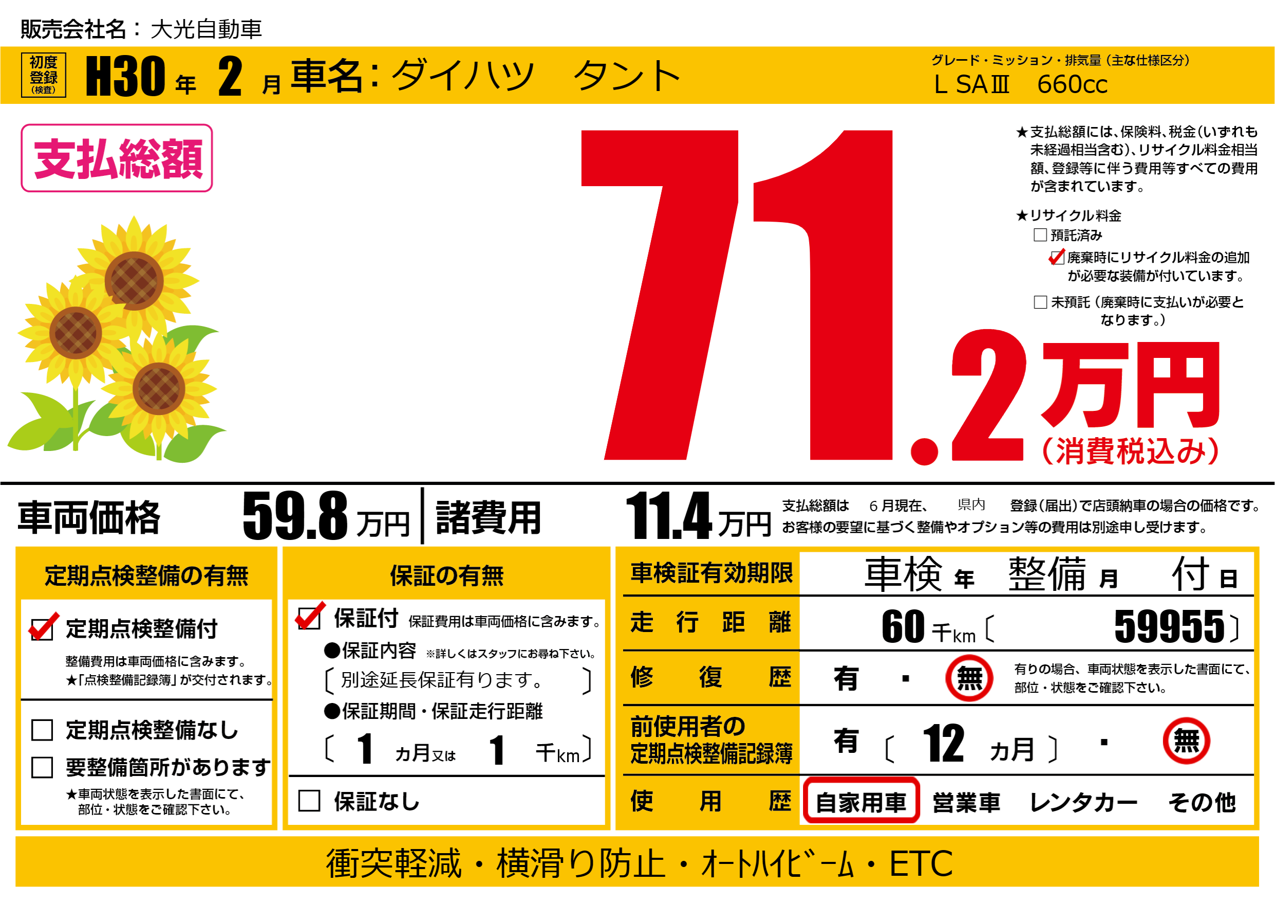 | 車名 | ダイハツ タント | グレード ミッション 排気量 |