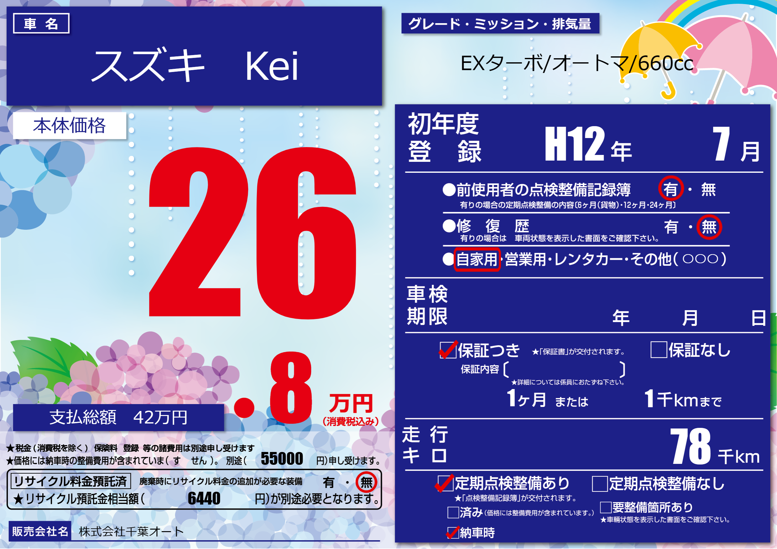 | 走行キロ | 7.8万km | 初年度登録 | H12年7月 |