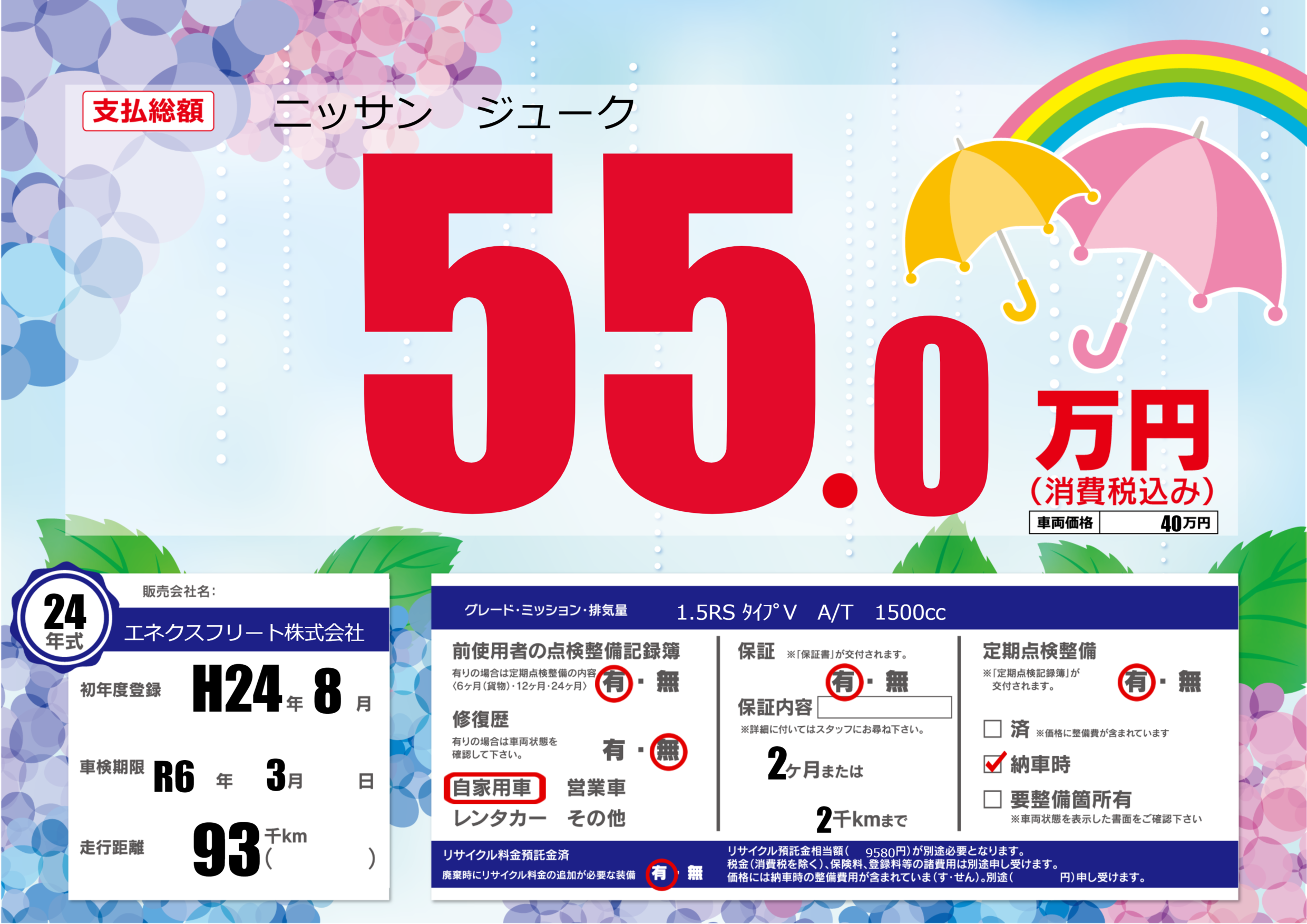 | 車名 | ニッサン ジューク | グレード ミッション 排気量 |