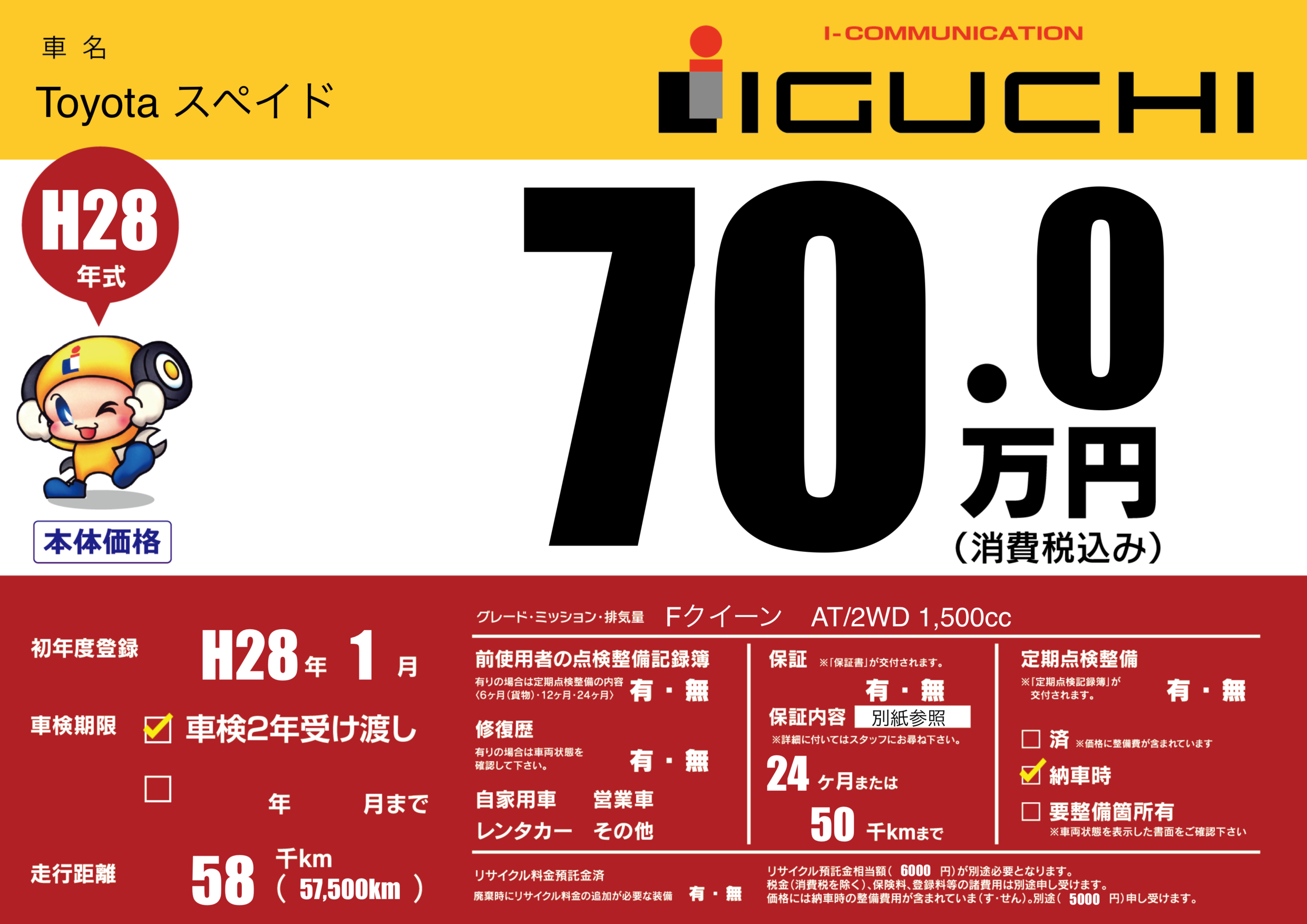 | 車名 | Toyota スペイド | グレード ミッション 排気量 |