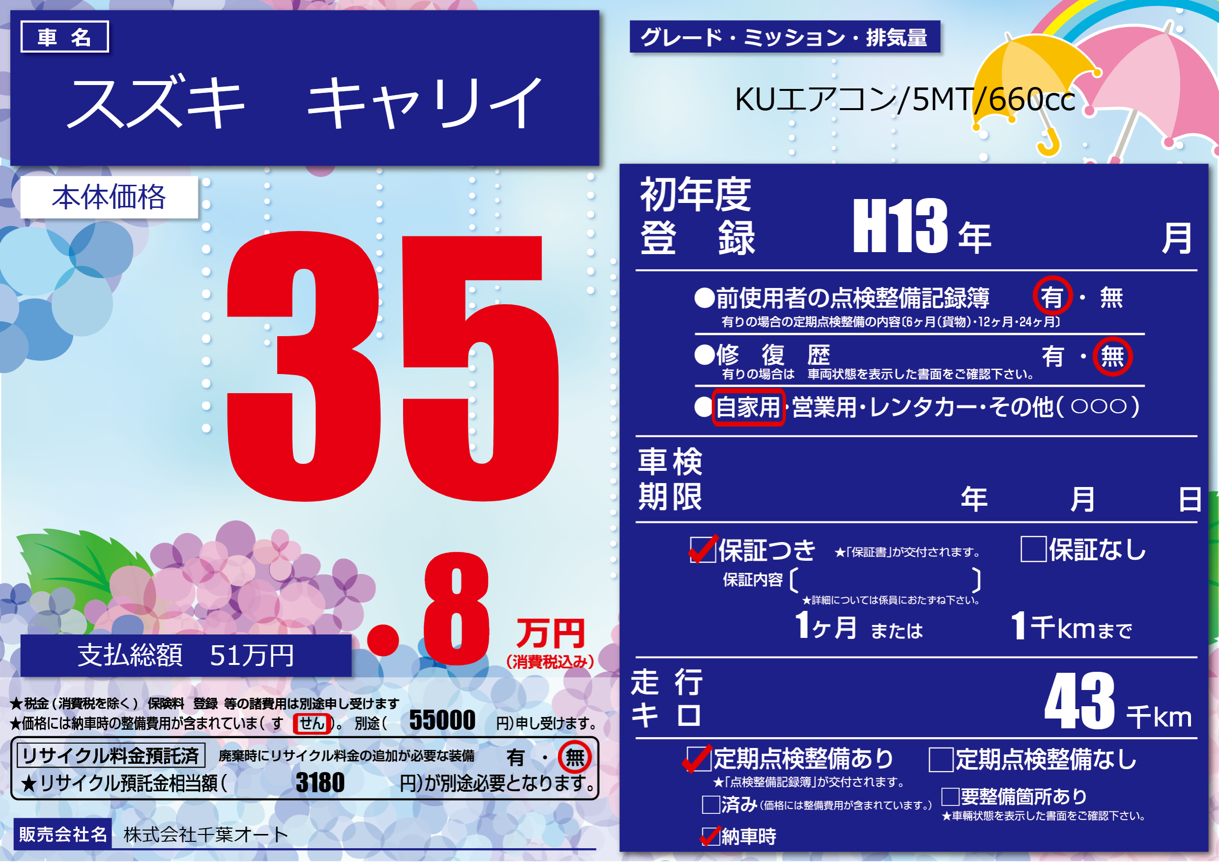 | 車名 | スズキ キャリイ | グレード ミッション 排気量 |