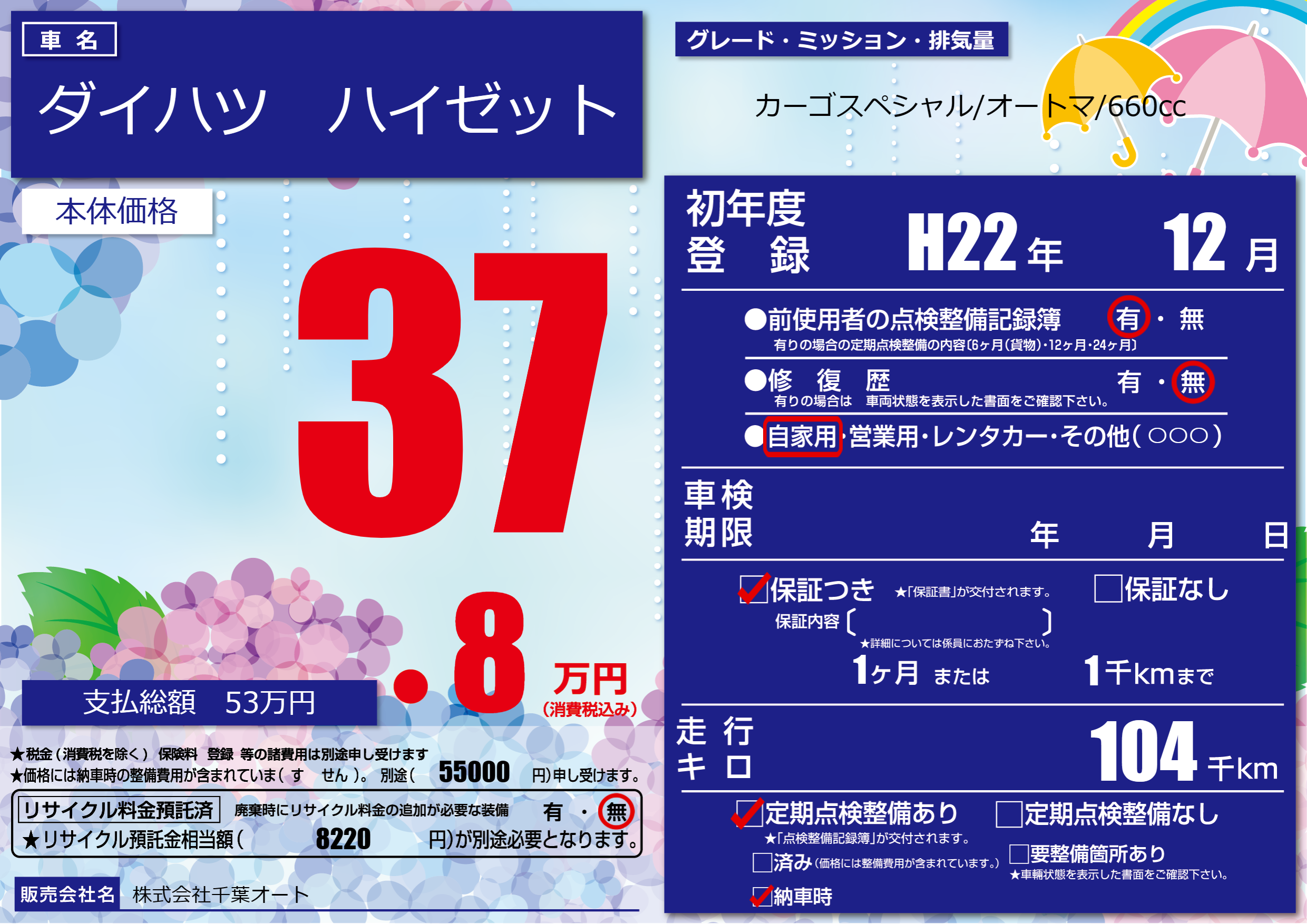 | 車名 | ダイハツ ハイゼット | グレード ミッション 排気量 |