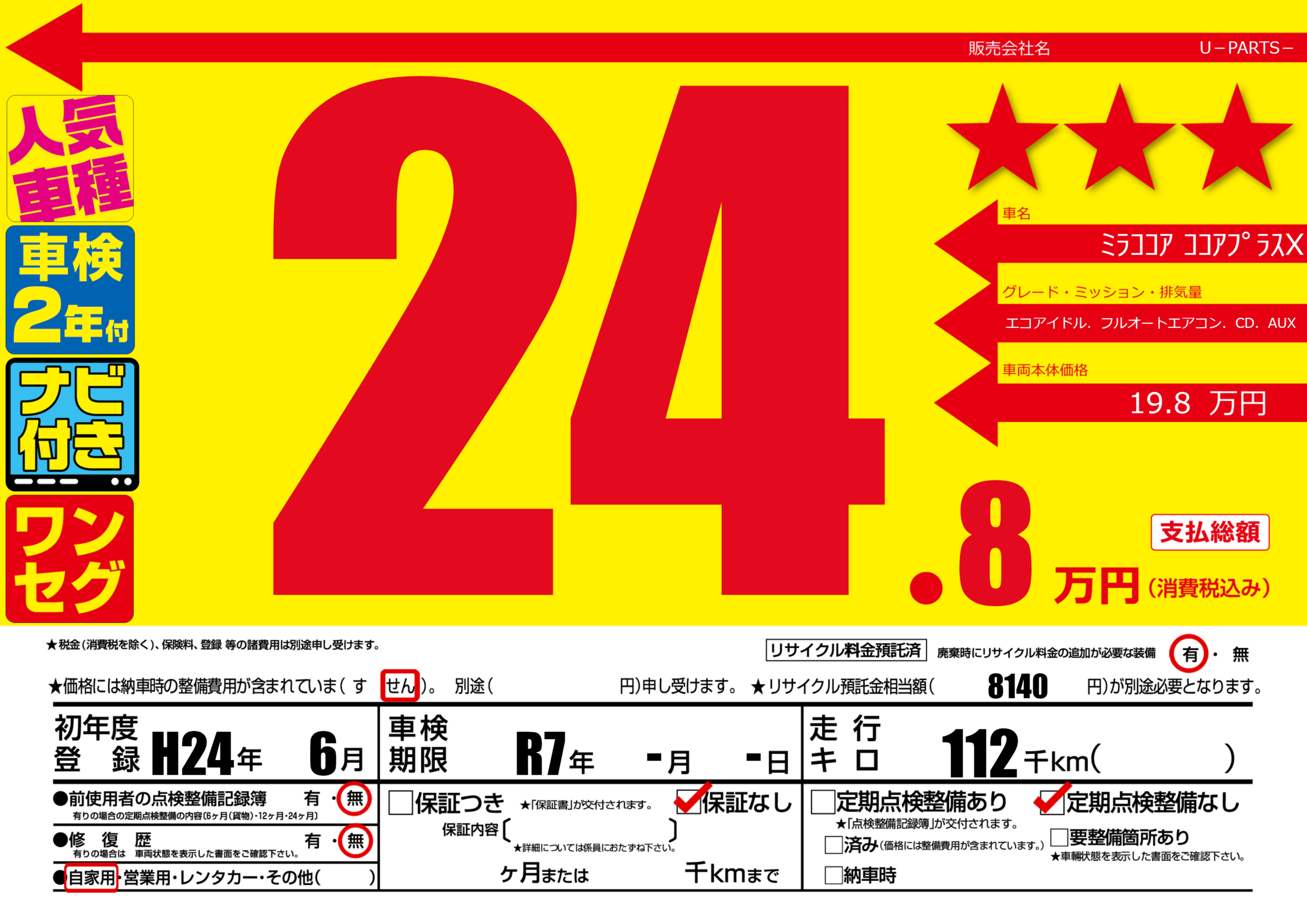 | 走行キロ | 11.2万km | 初年度登録 | H24年6月 |