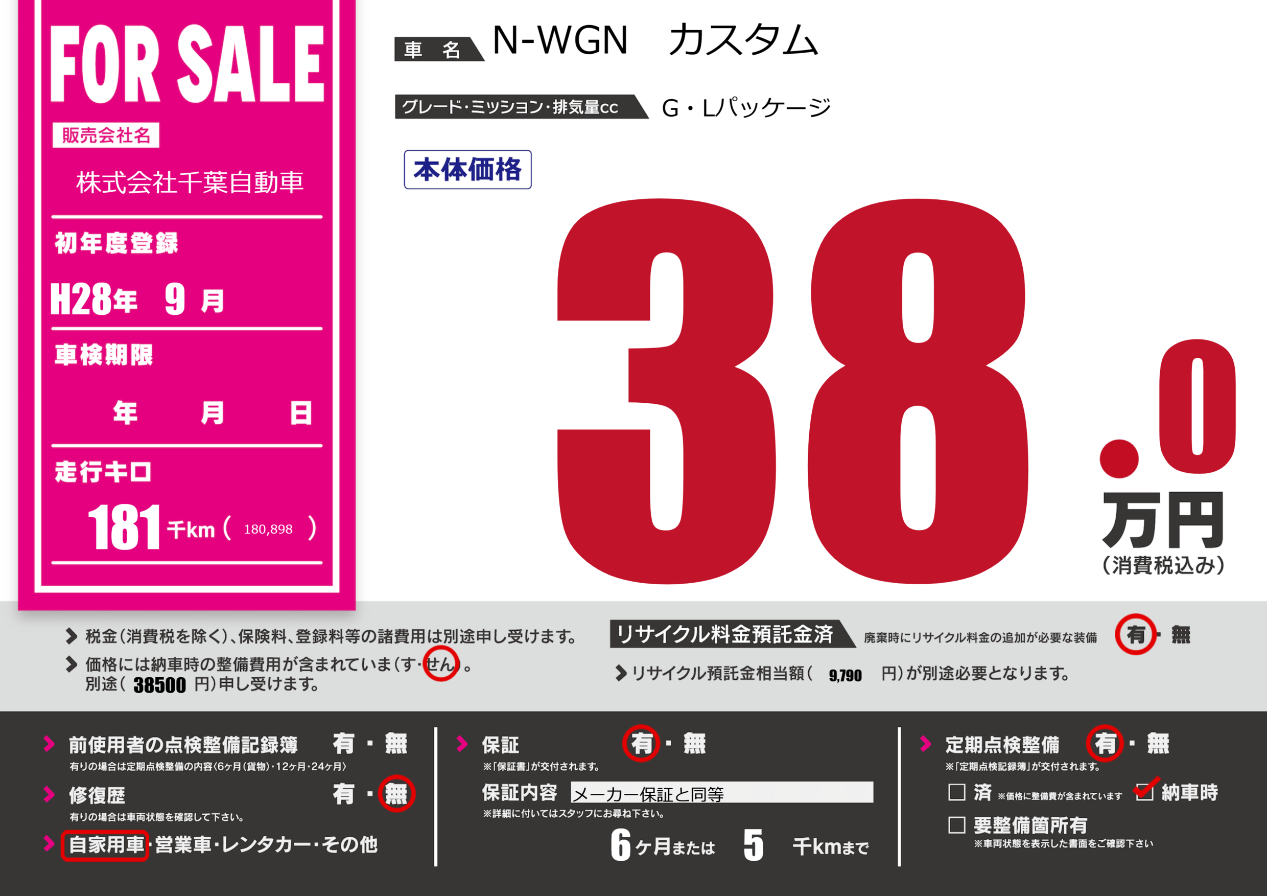| 車名 | N-WGN カスタム | グレード ミッション 排気量 |