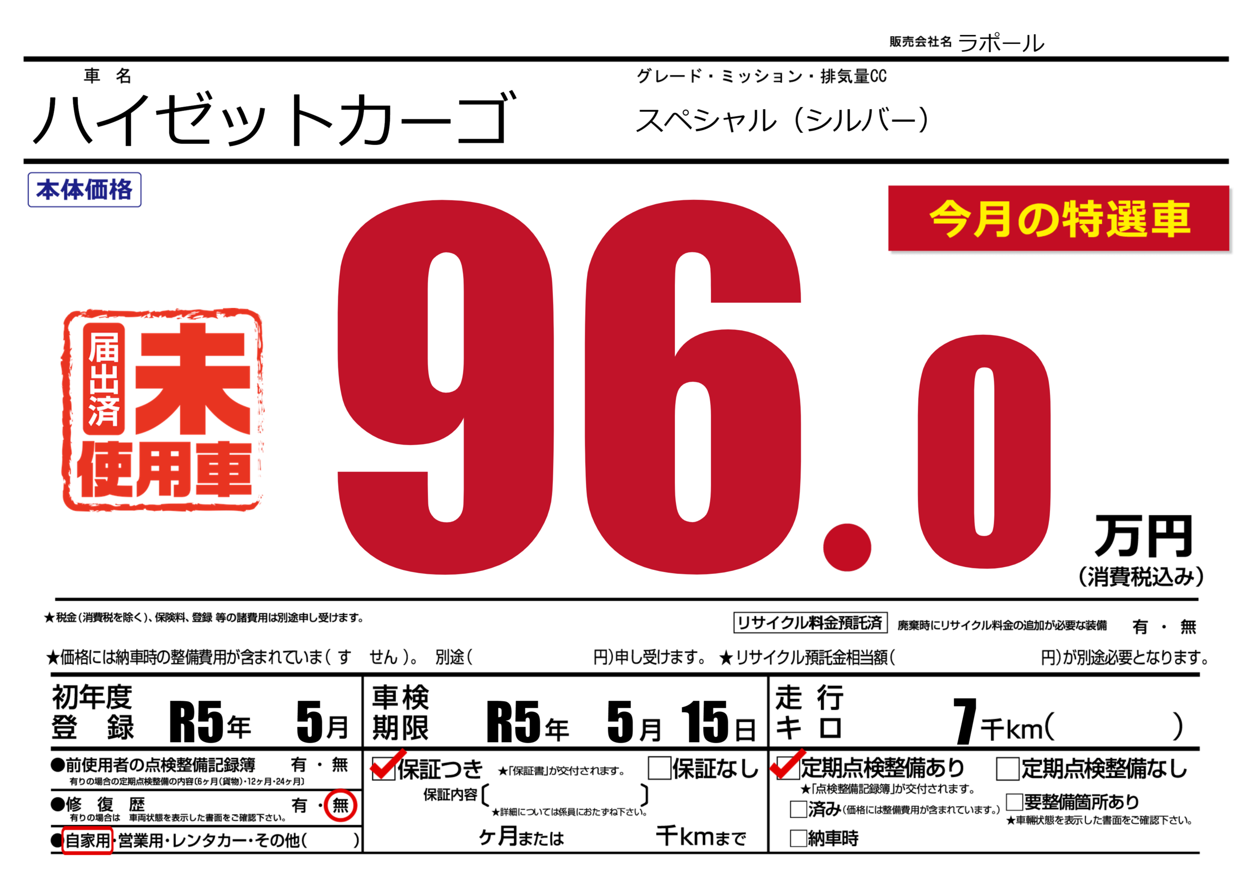 | 走行キロ | 0.7万km | 初年度登録 | R5年5月 |