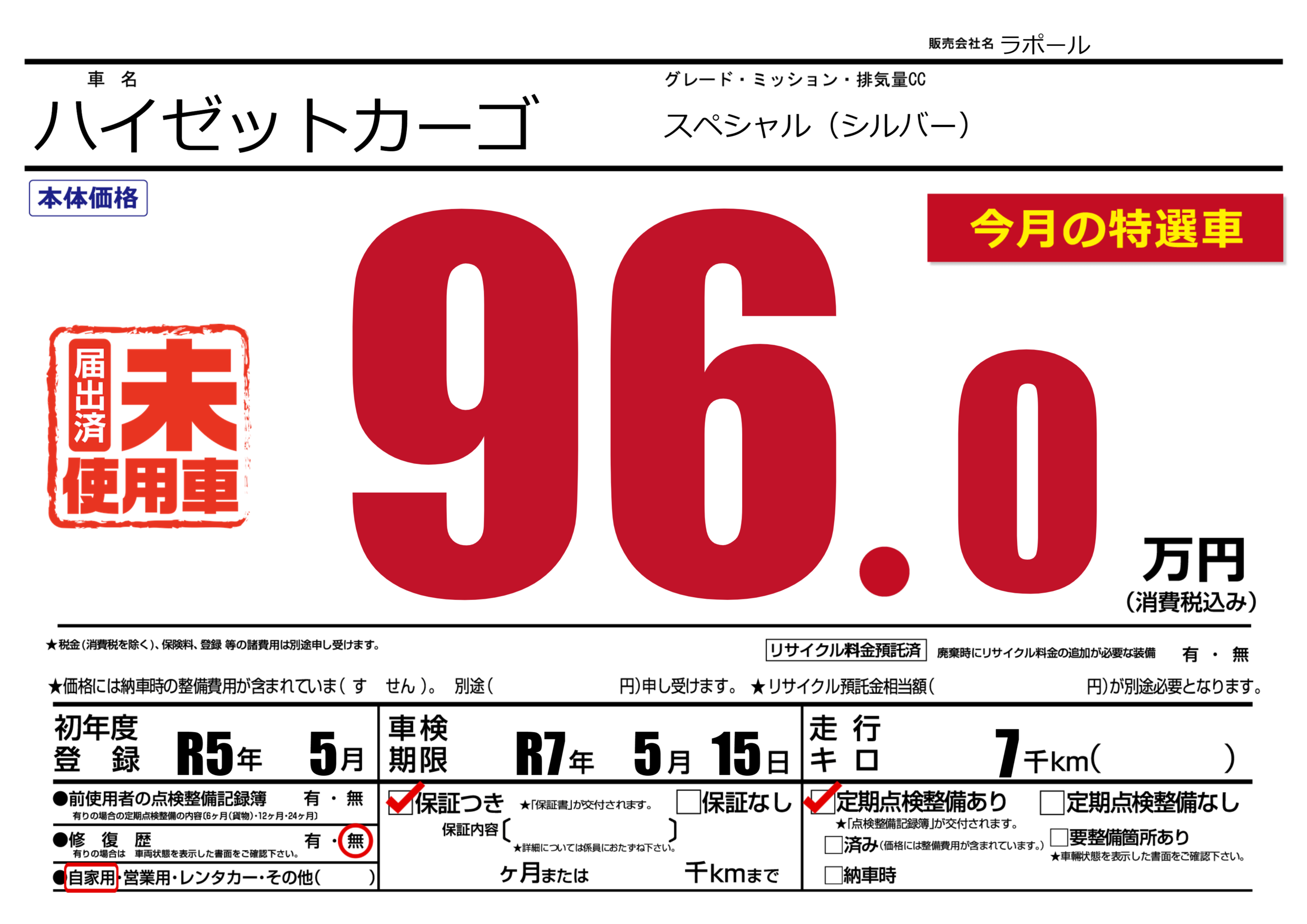 | 車名 | ハイゼットカーゴ | グレード ミッション 排気量 |