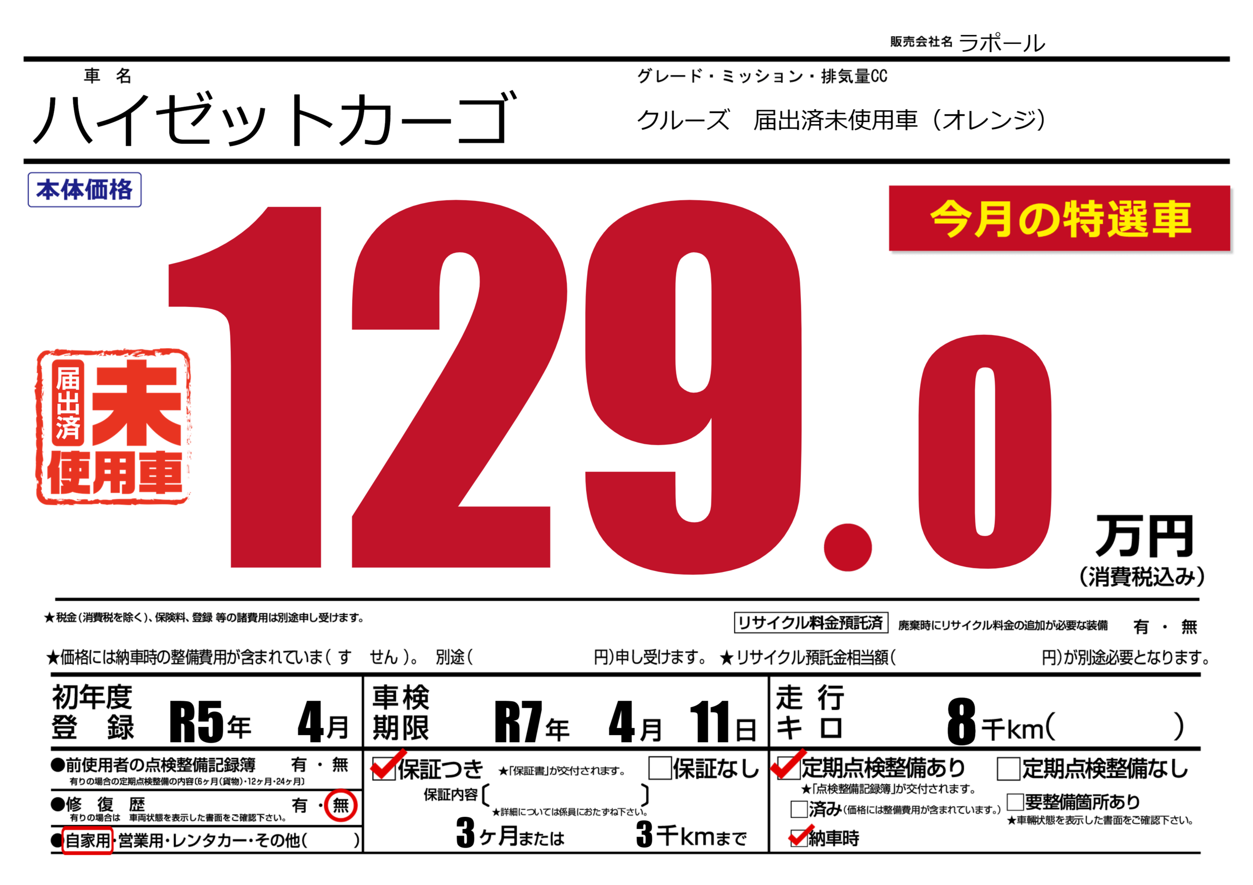 保証付き 保証内容(---) 3ヶ月または(3)千kmまで |