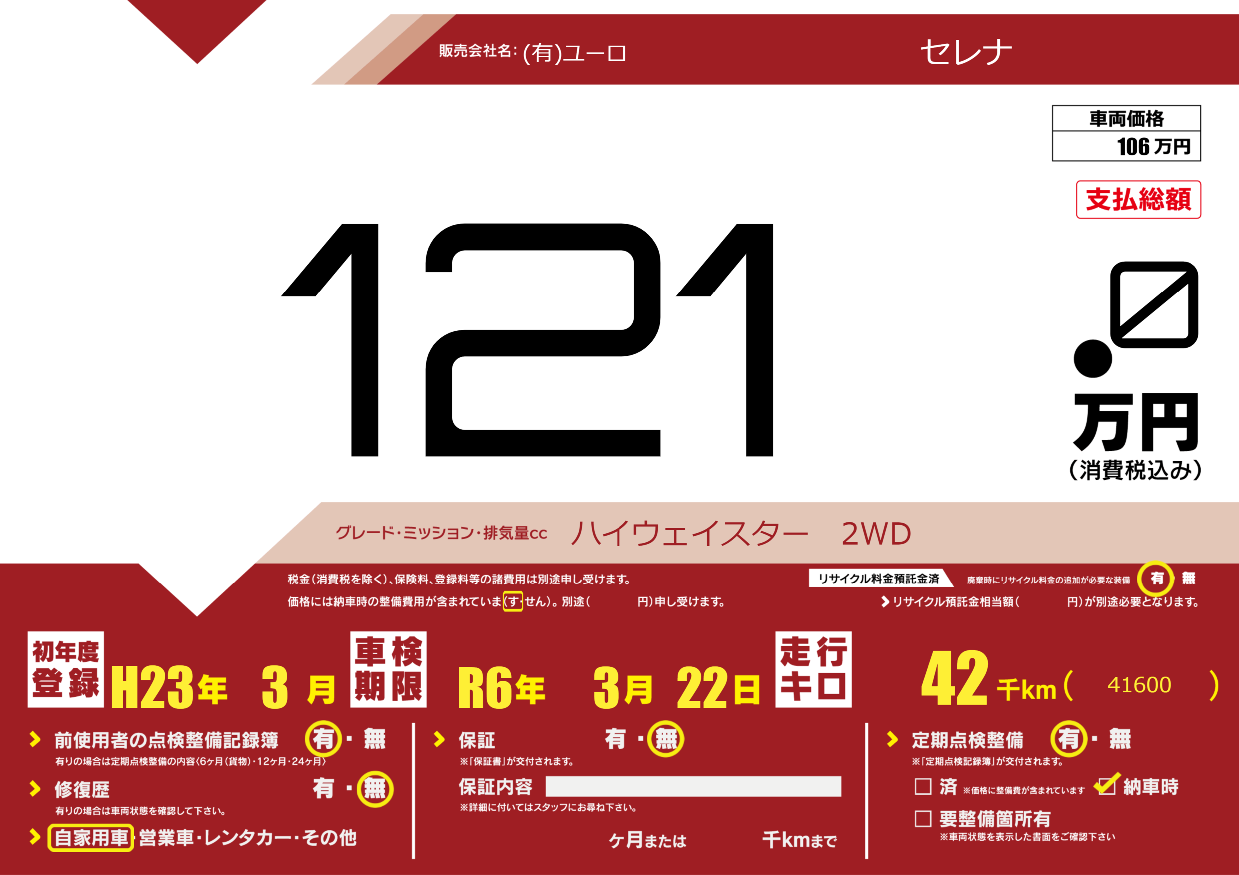| 走行キロ | 4.2万km | 初年度登録 | H23年3月 |
