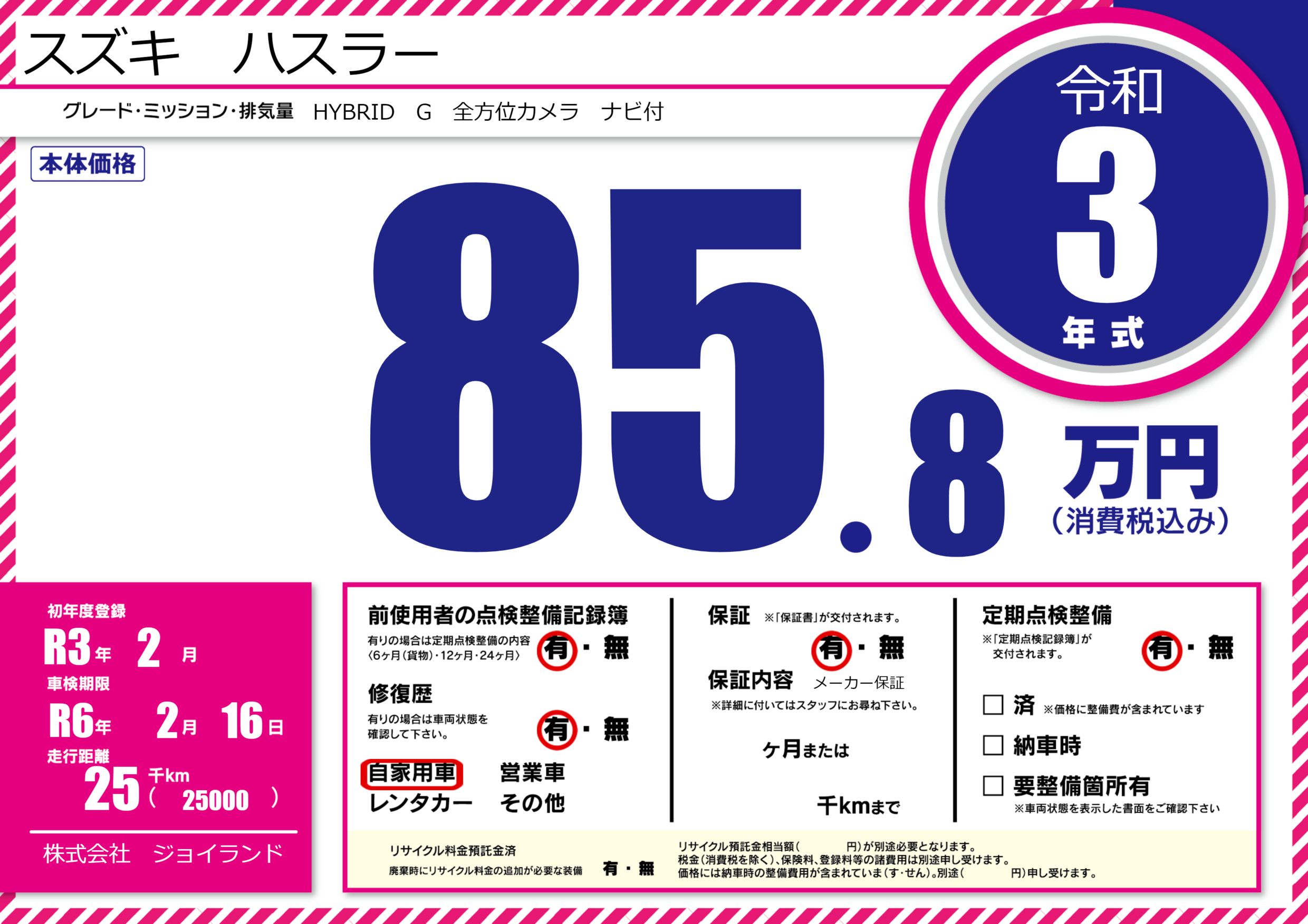 | 車名 | スズキ ハスラー | グレード ミッション 排気量 |