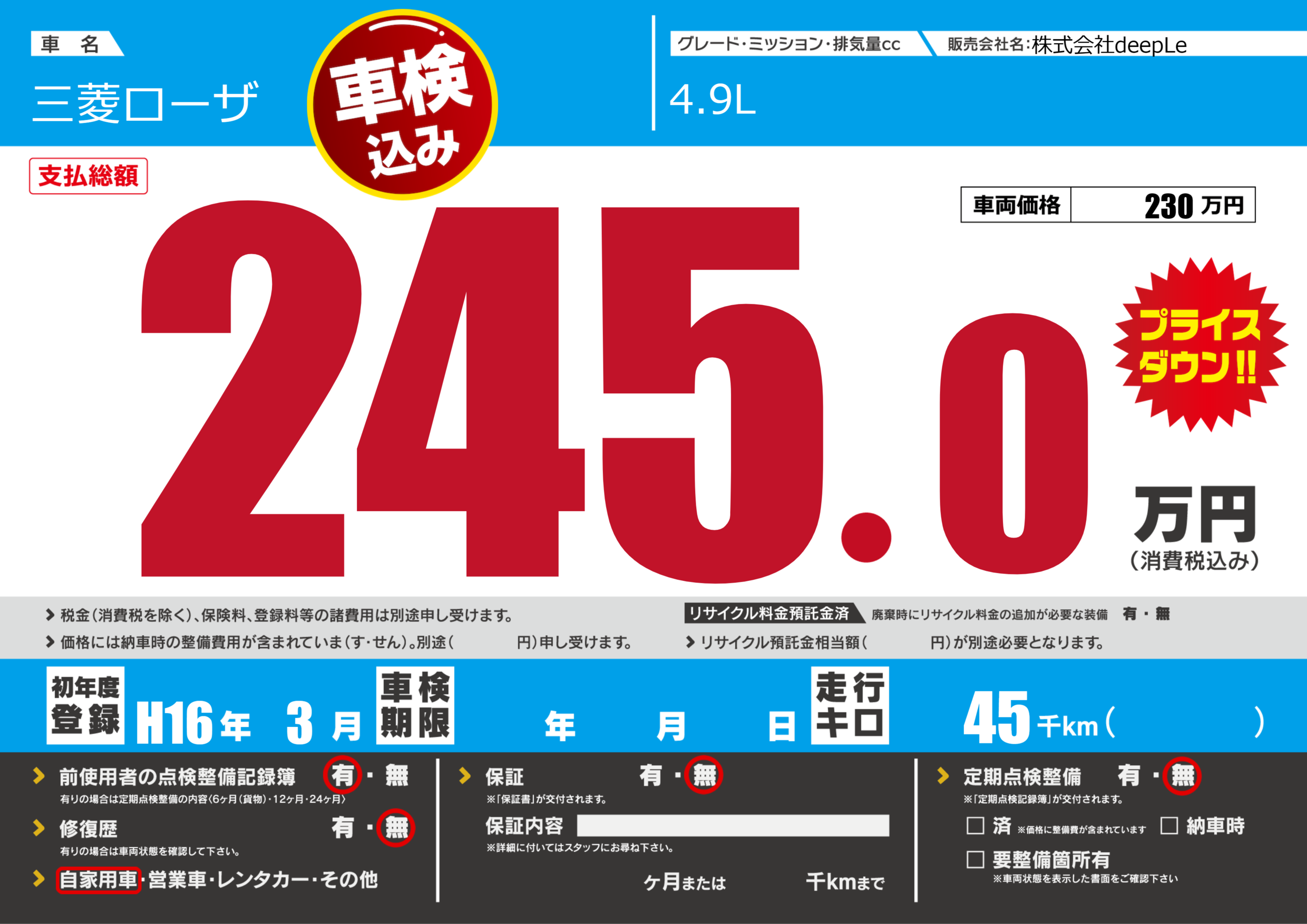 | 走行キロ | 4.5万km | 初年度登録 | H16年3月 |