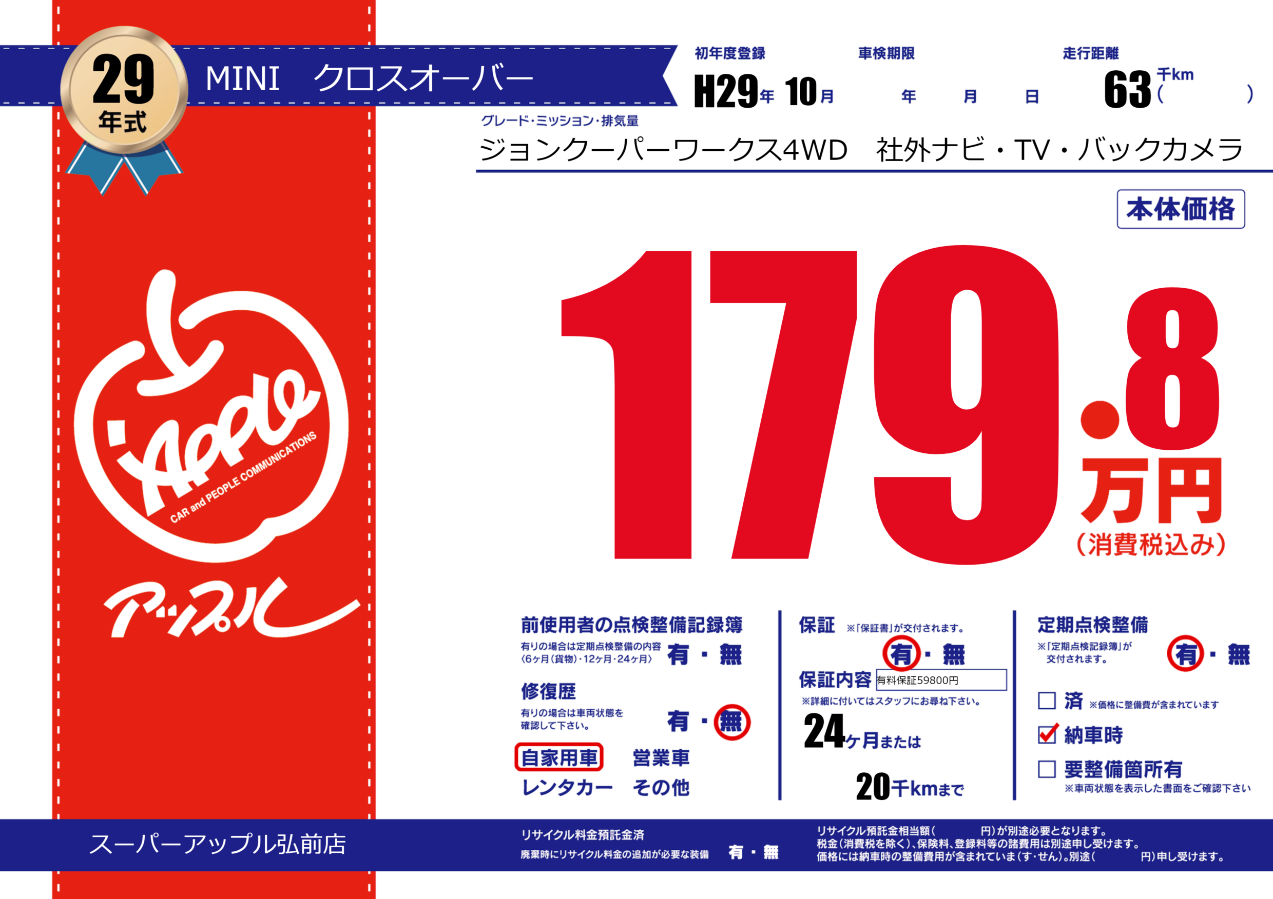 ジョンクーパーワークス4WD 社外ナビ・TV・バックカメラ |