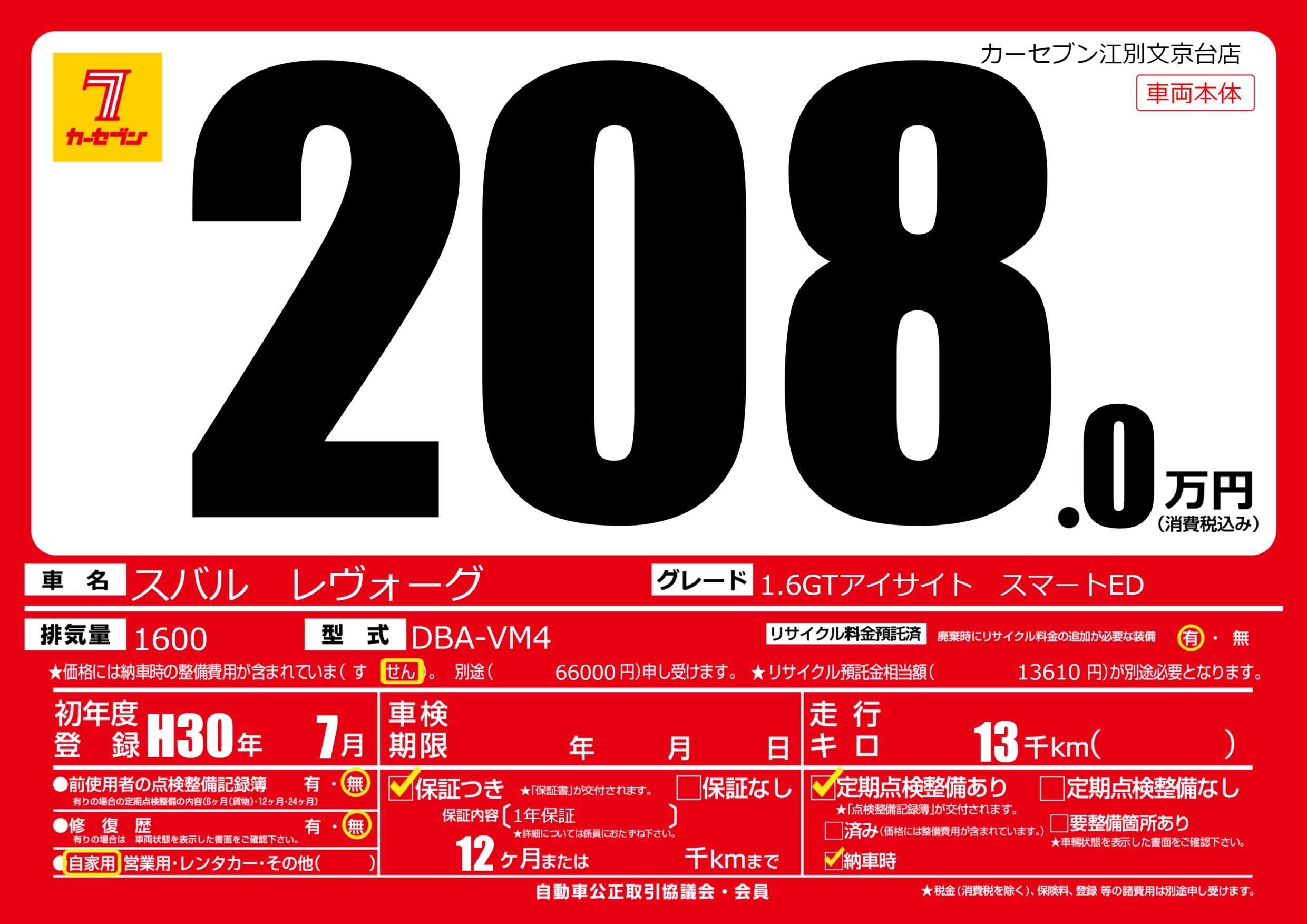 | 車名 | スバル レヴォーグ | グレード ミッション 排気量 |