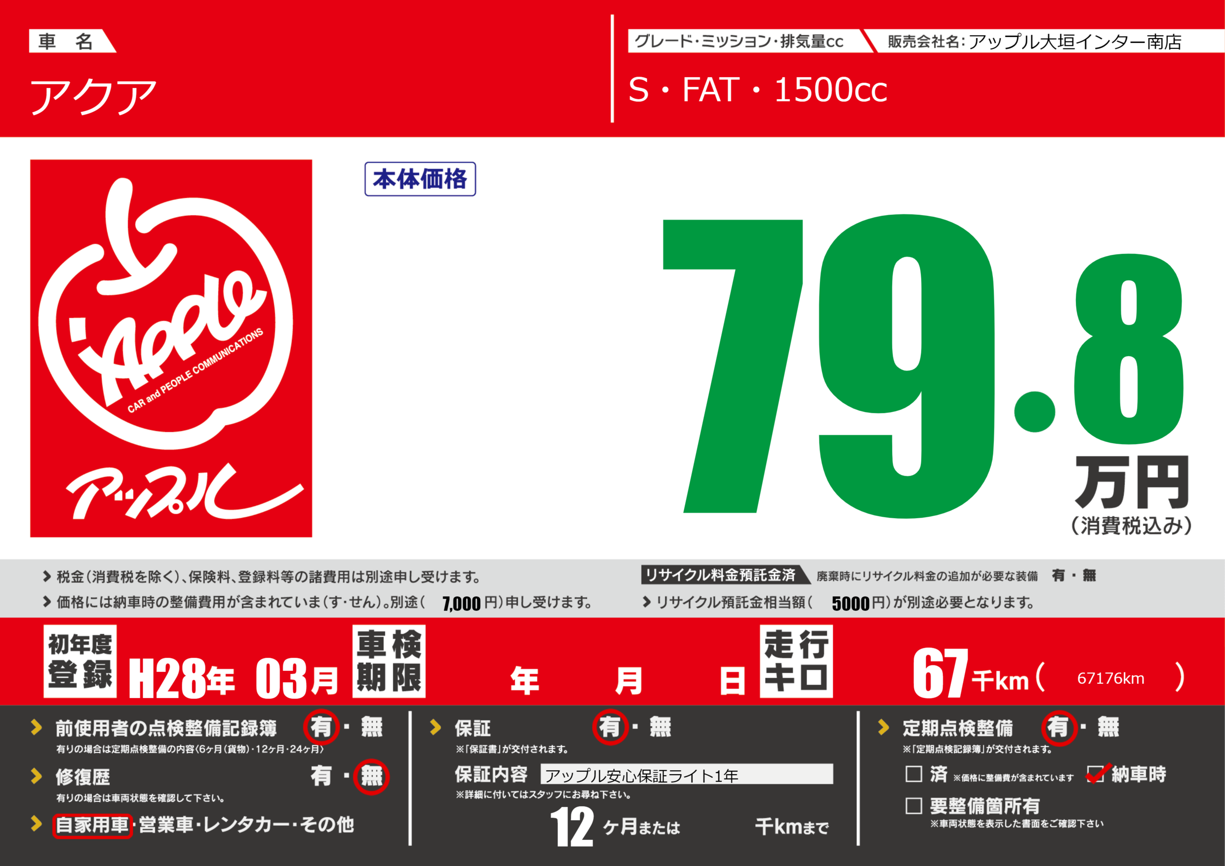 | 定期点検整備 | 定期点検整備あり 納車時あり | ||