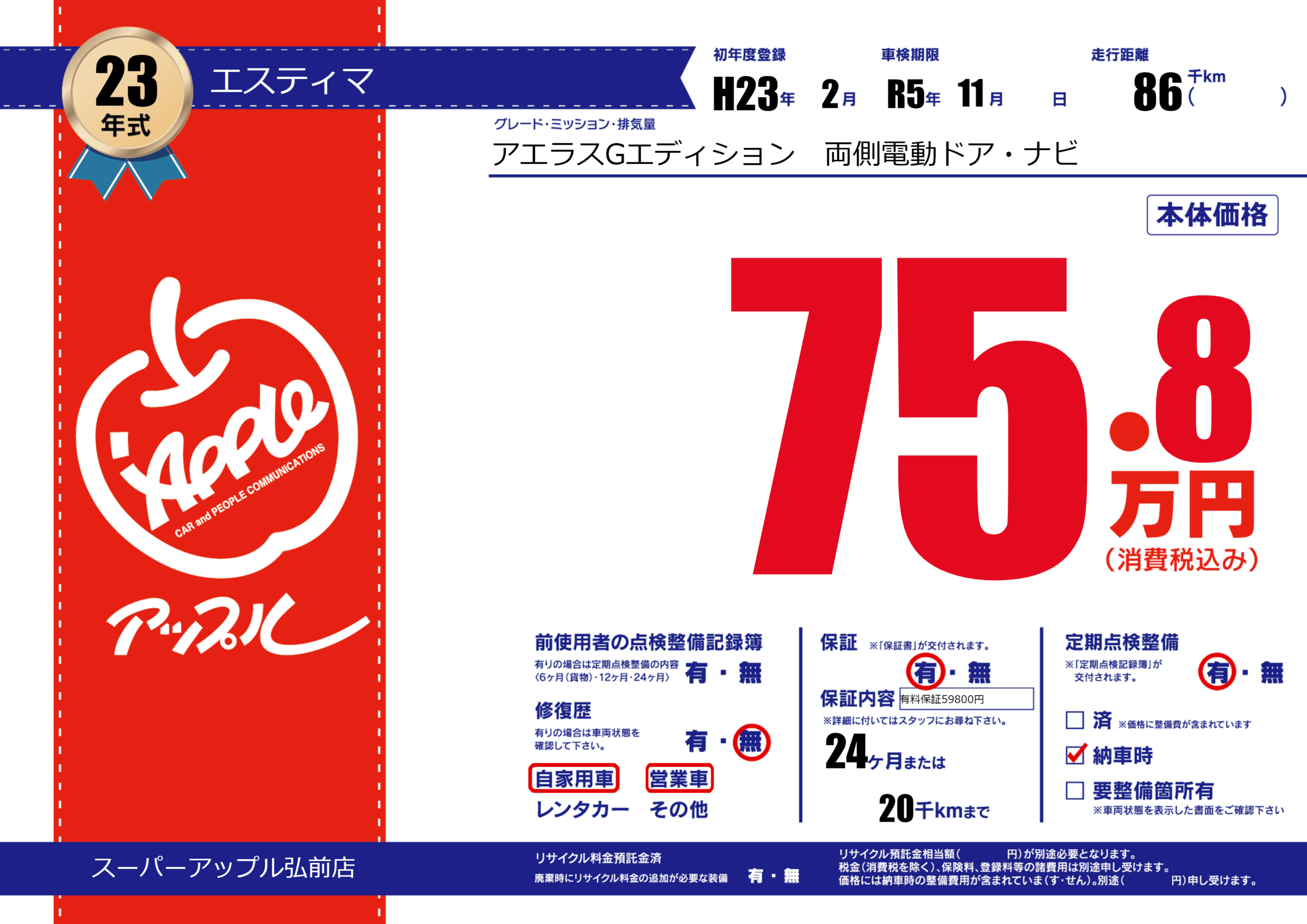 保証付き 保証内容(有料保証59800円) 24ヶ月または(20)千kmまで |