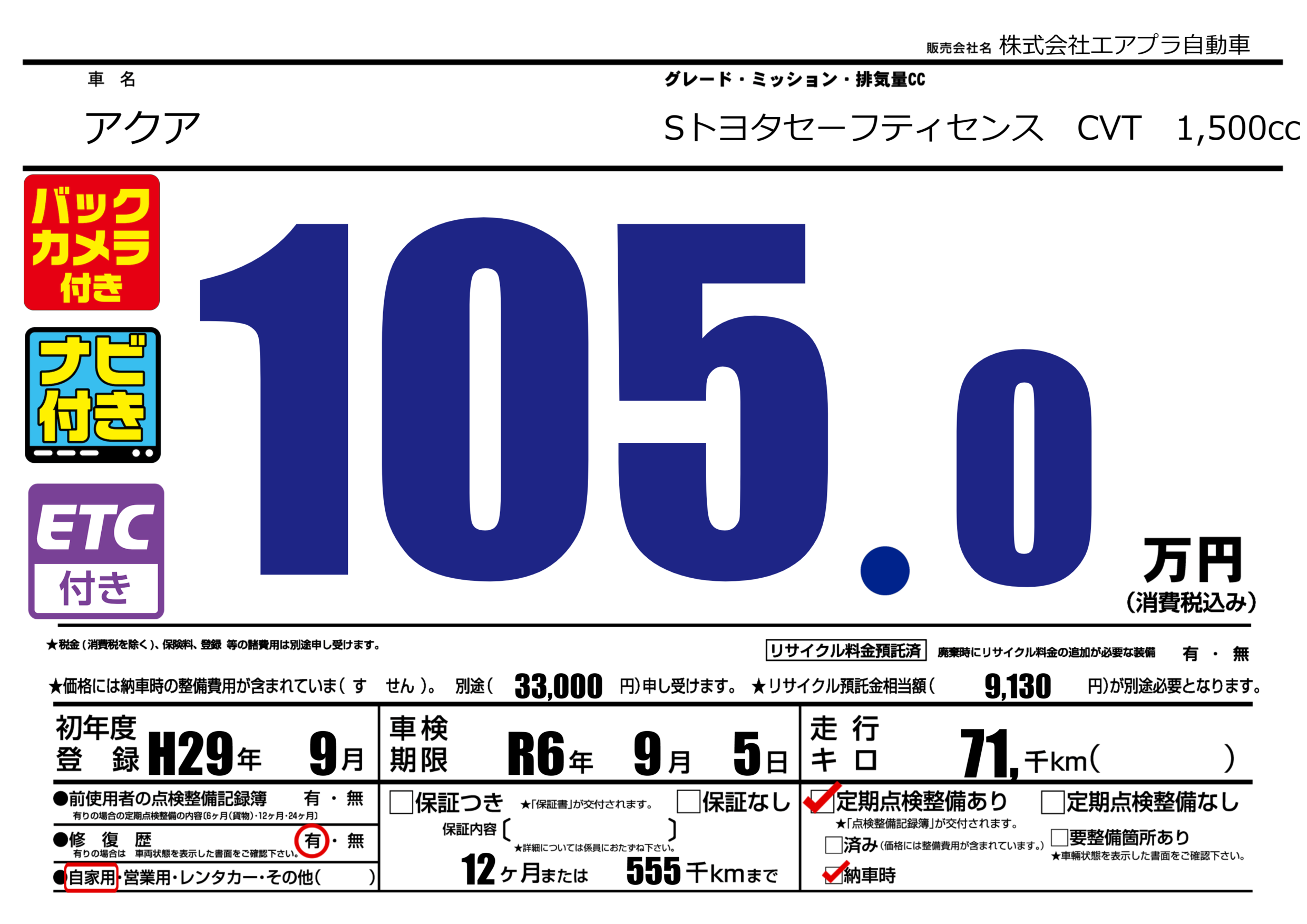 | 走行キロ | 7.1万km | 初年度登録 | H29年9月 |