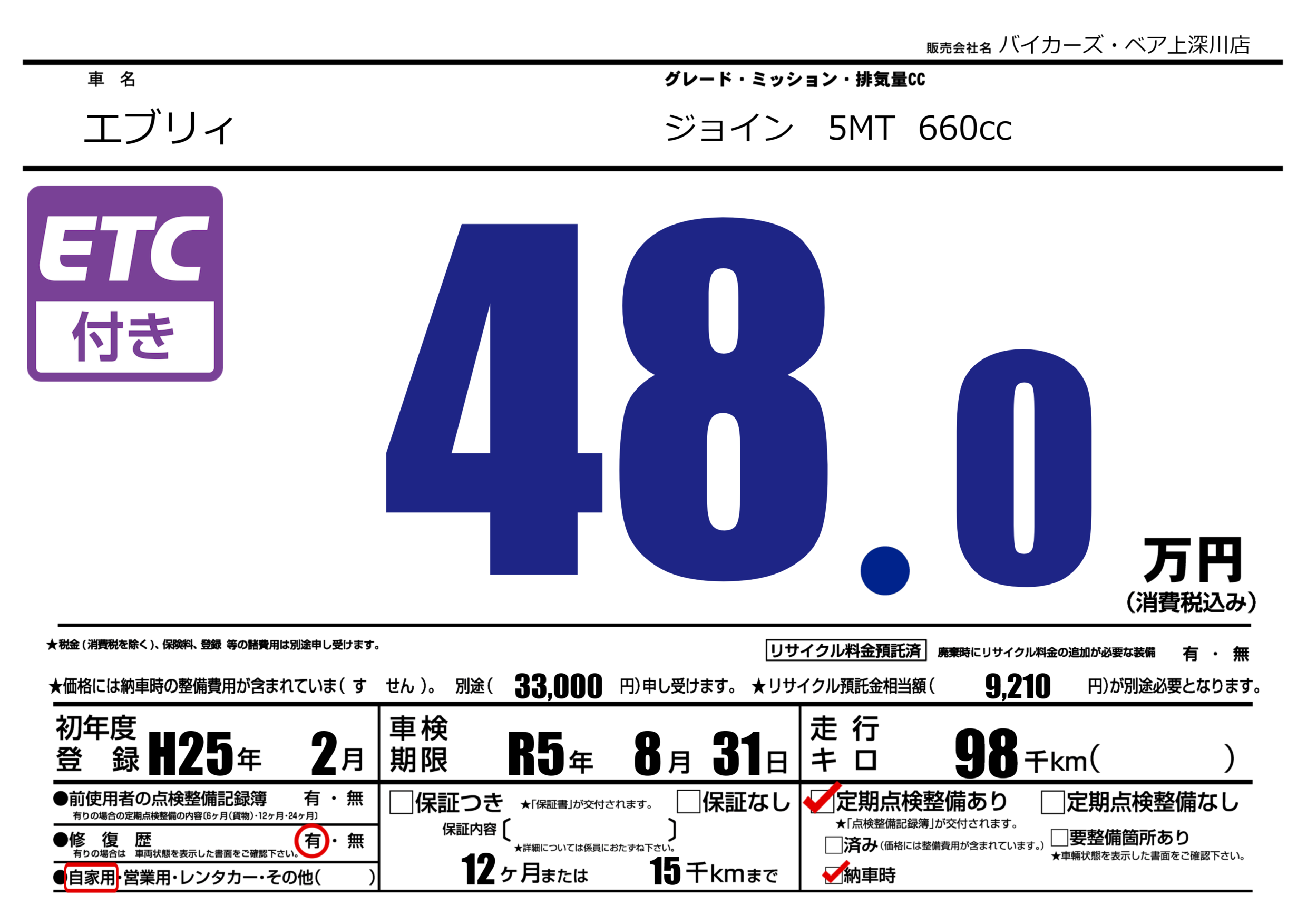 車検制限 | R5年8月31月 |
