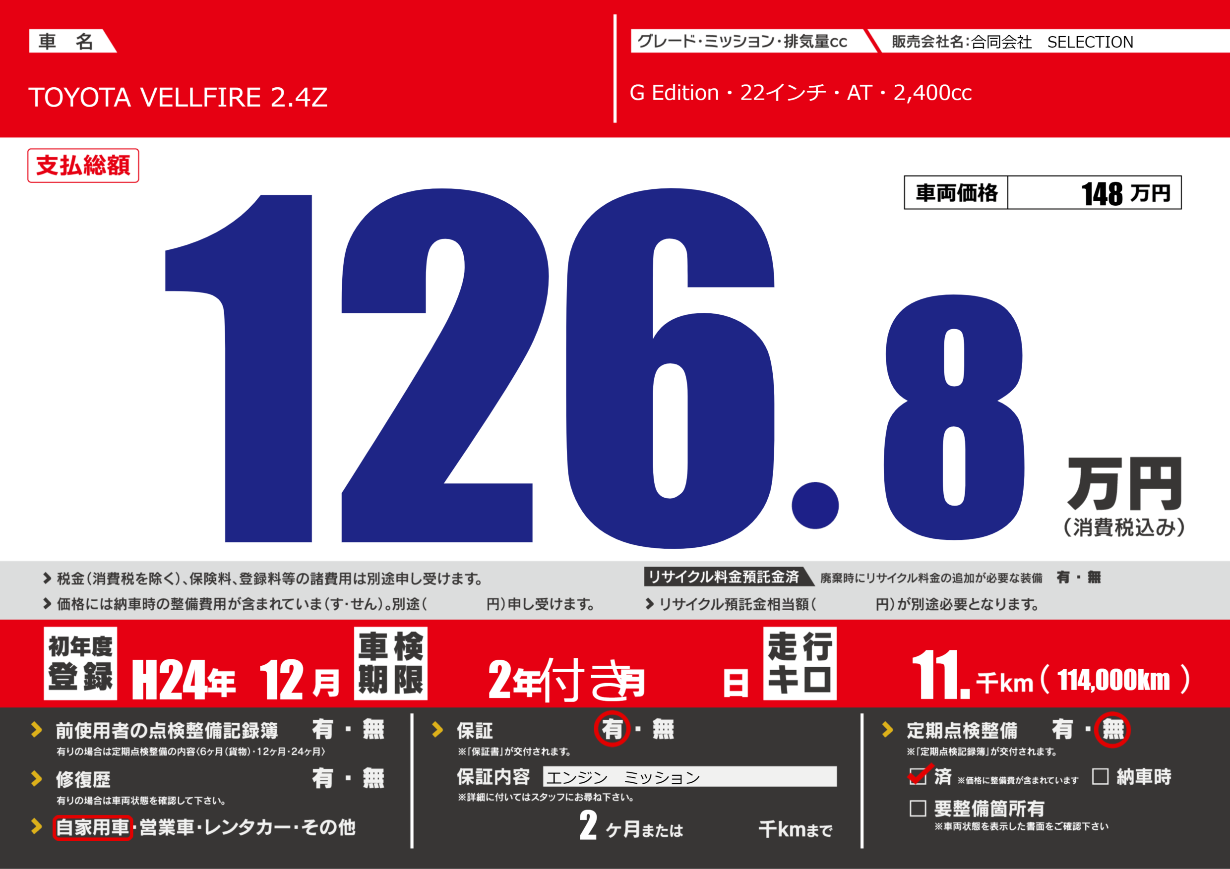 | 車名 | TOYOTA VELLFIRE 2.4Z | グレード ミッション 排気量 |