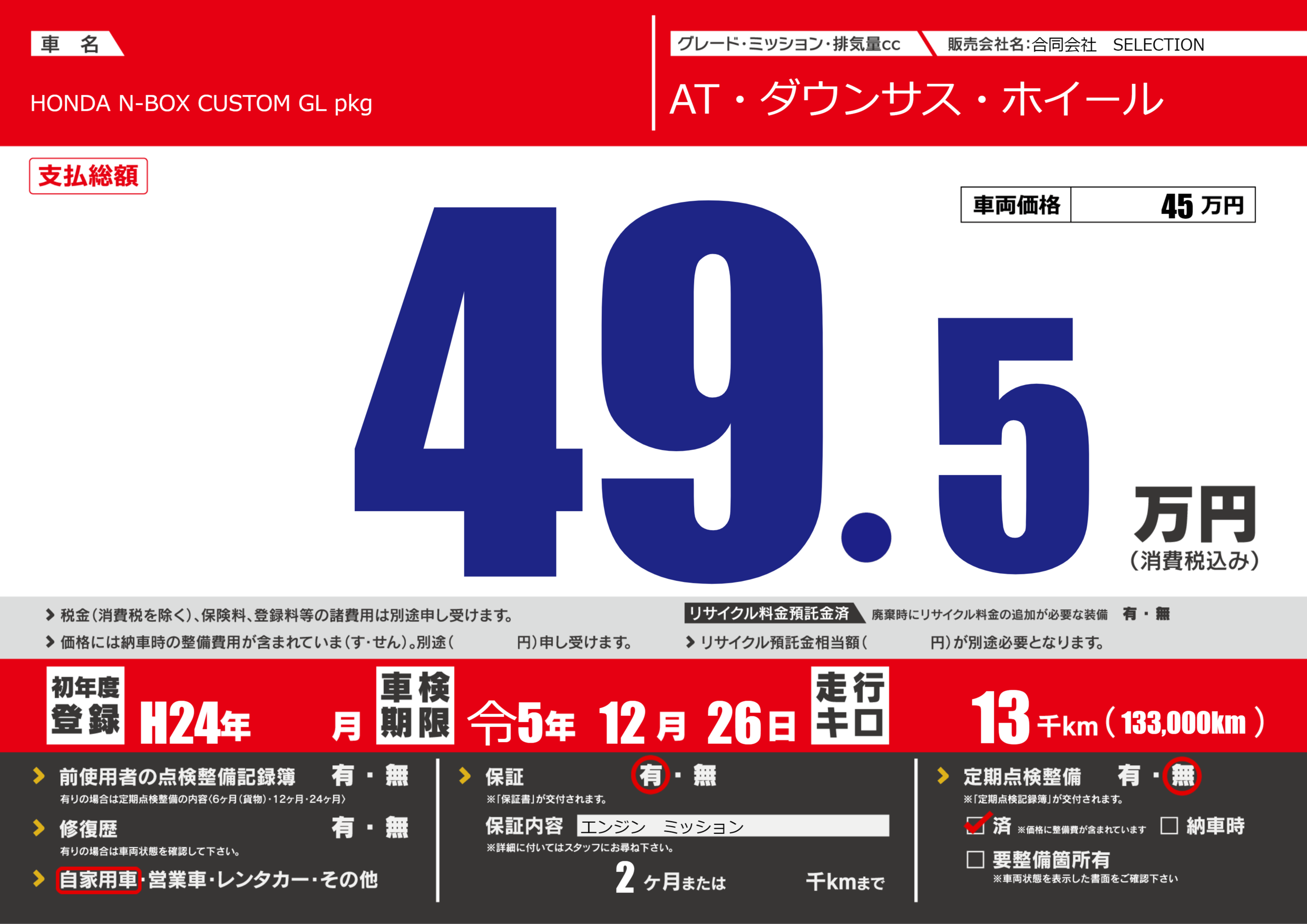 | 車名 | HONDA N-BOX CUSTOM GL pkg | グレード ミッション 排気量 |