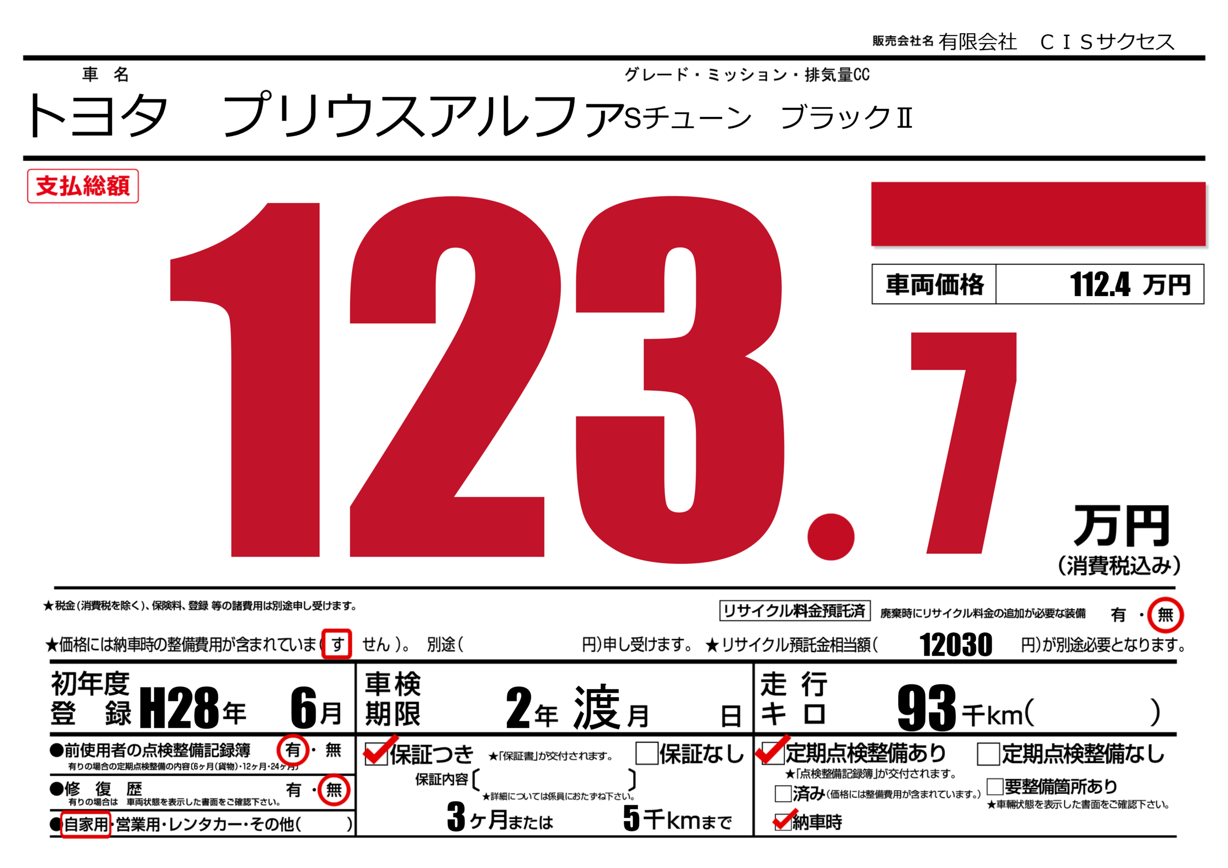 | 車名 | トヨタ プリウスアルファ | グレード ミッション 排気量 |