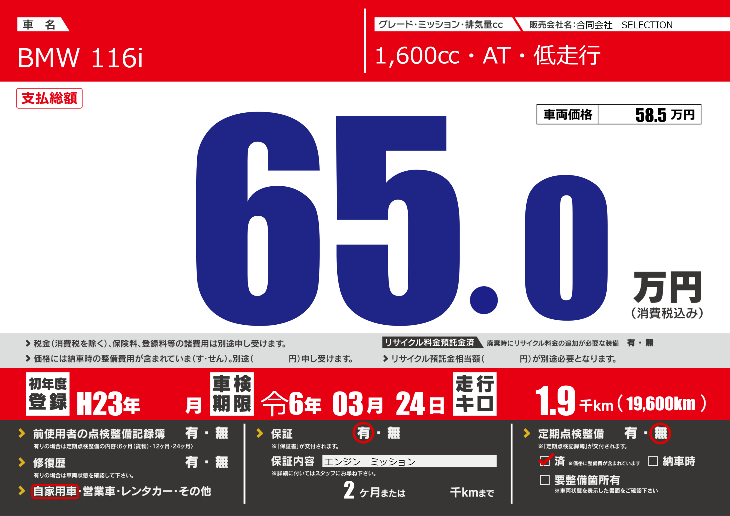 | 車名 | BMW 116i | グレード ミッション 排気量 |