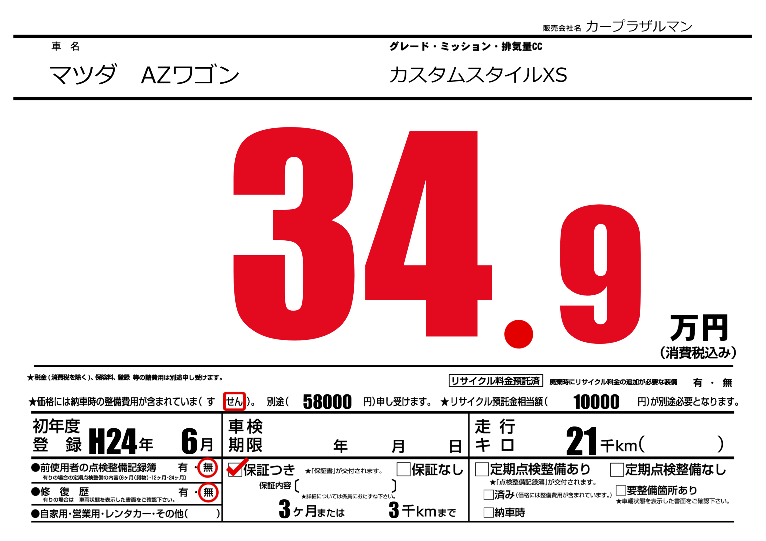 保証付き 保証内容(---) 3ヶ月または(3)千kmまで |