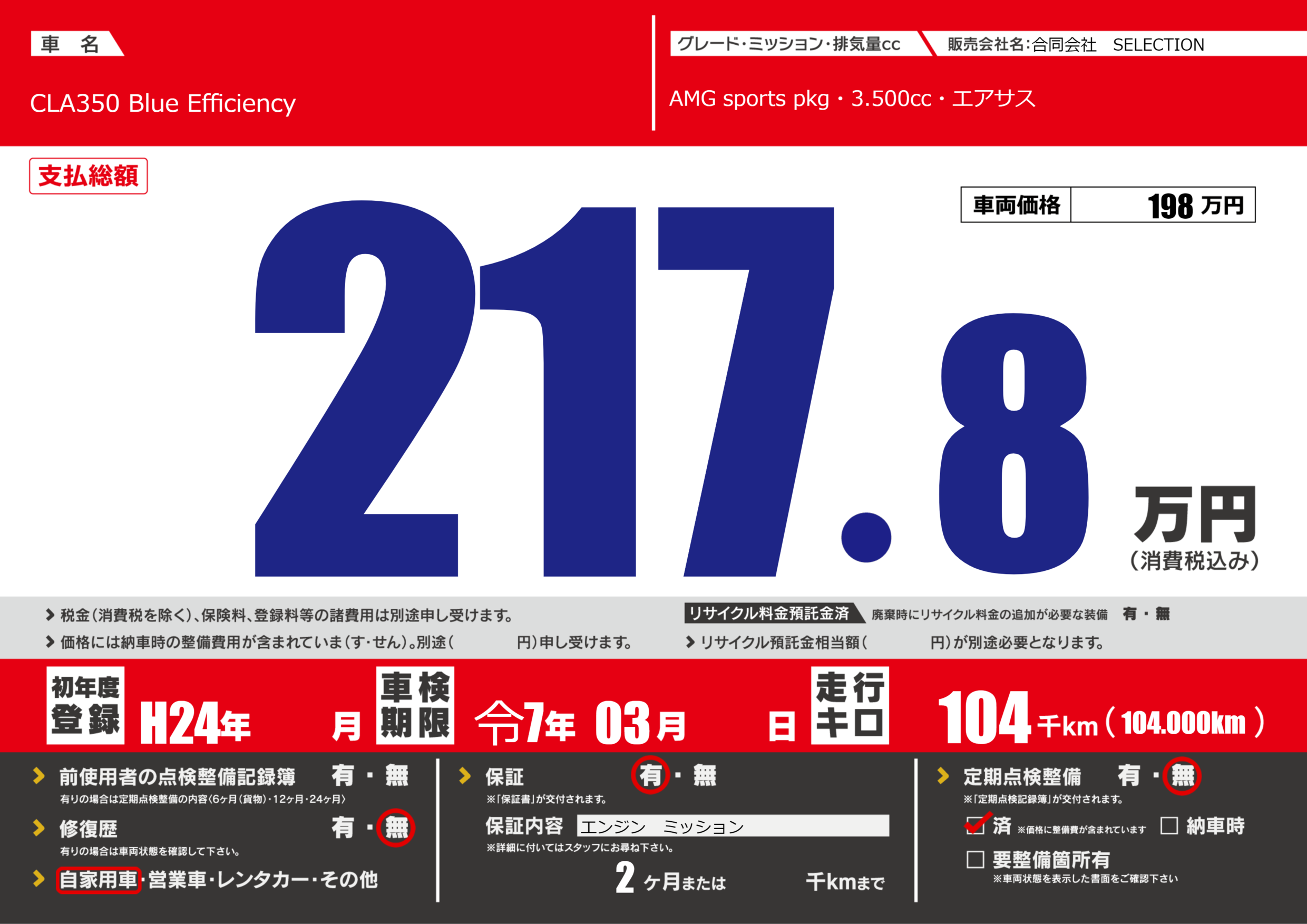 | 車名 | CLA350 Blue Efficiency | グレード ミッション 排気量 |