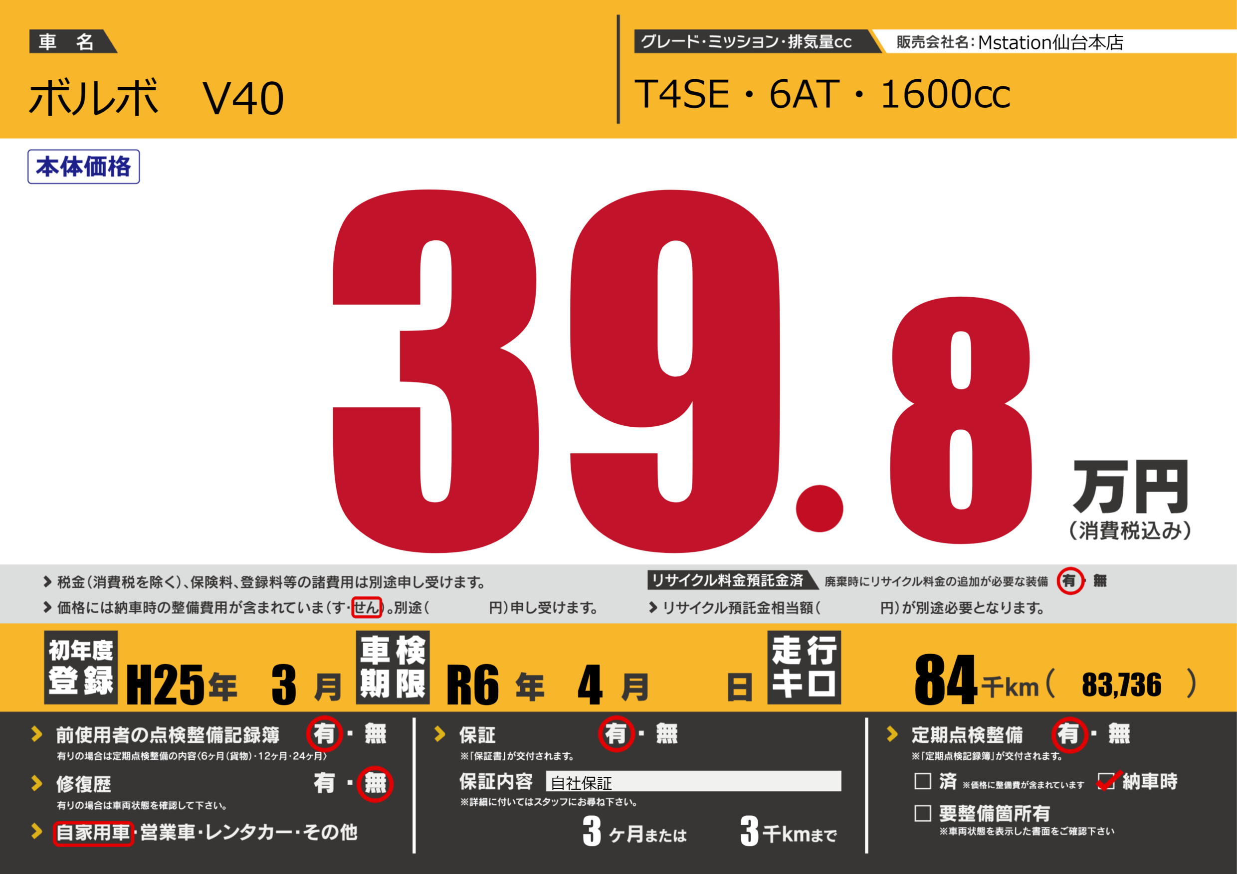 保証付き 保証内容(自社保証) 3ヶ月または(3)千kmまで |