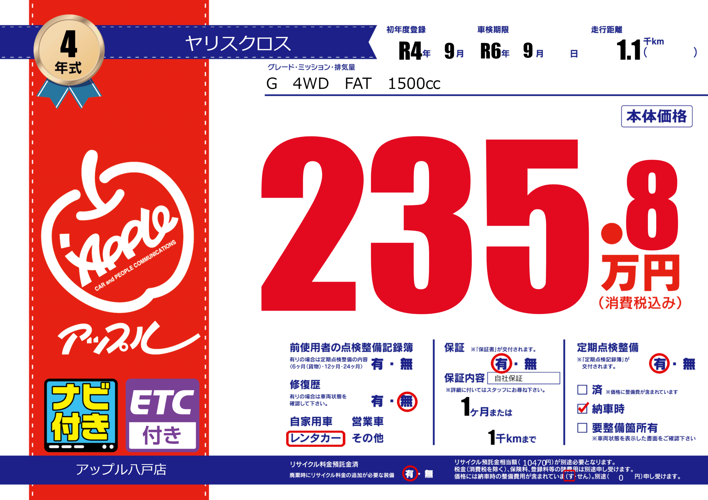 | 走行キロ | 0.1万km | 初年度登録 | R4年9月 |