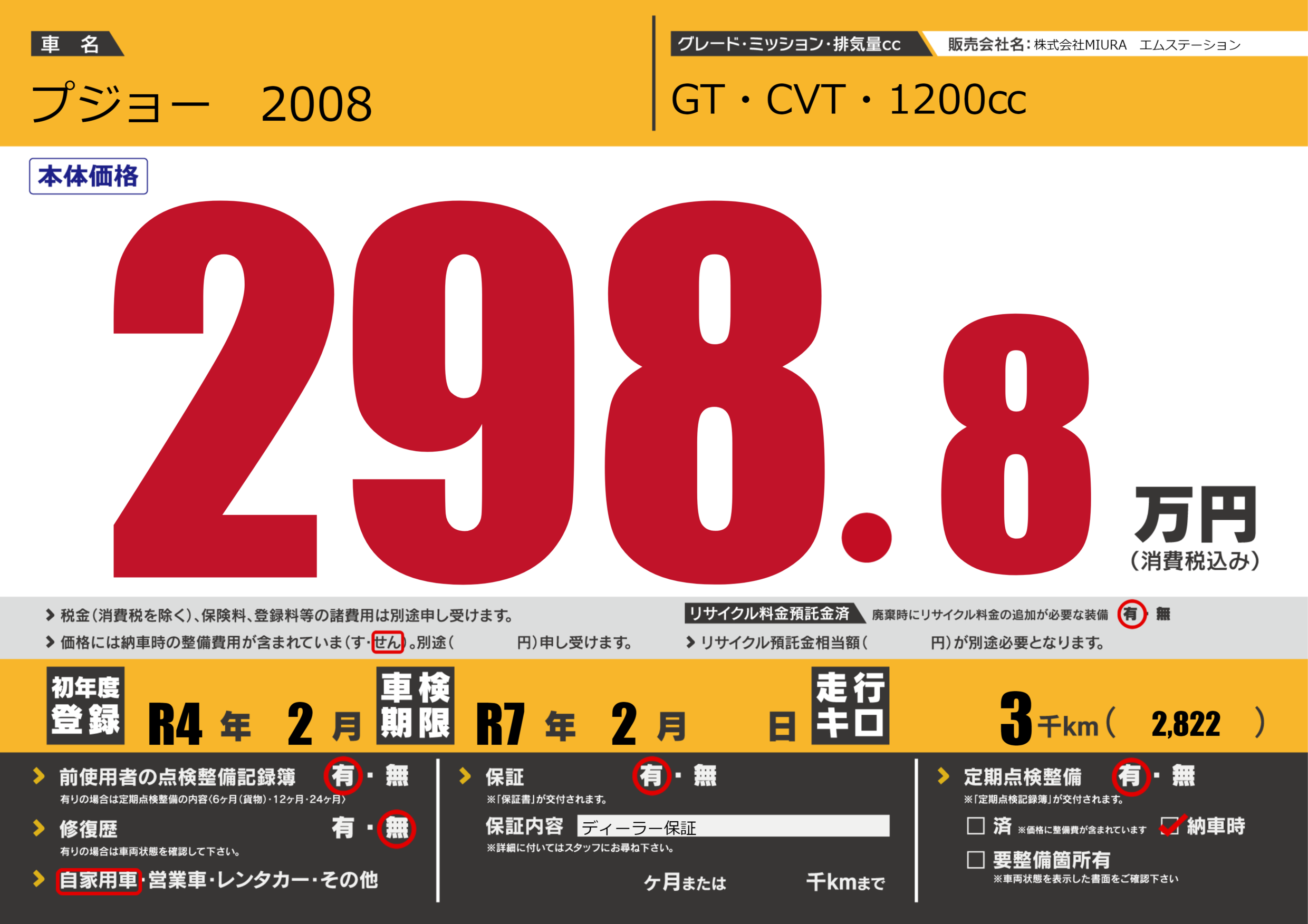 | 車名 | プジョー 2008 | グレード ミッション 排気量 |
