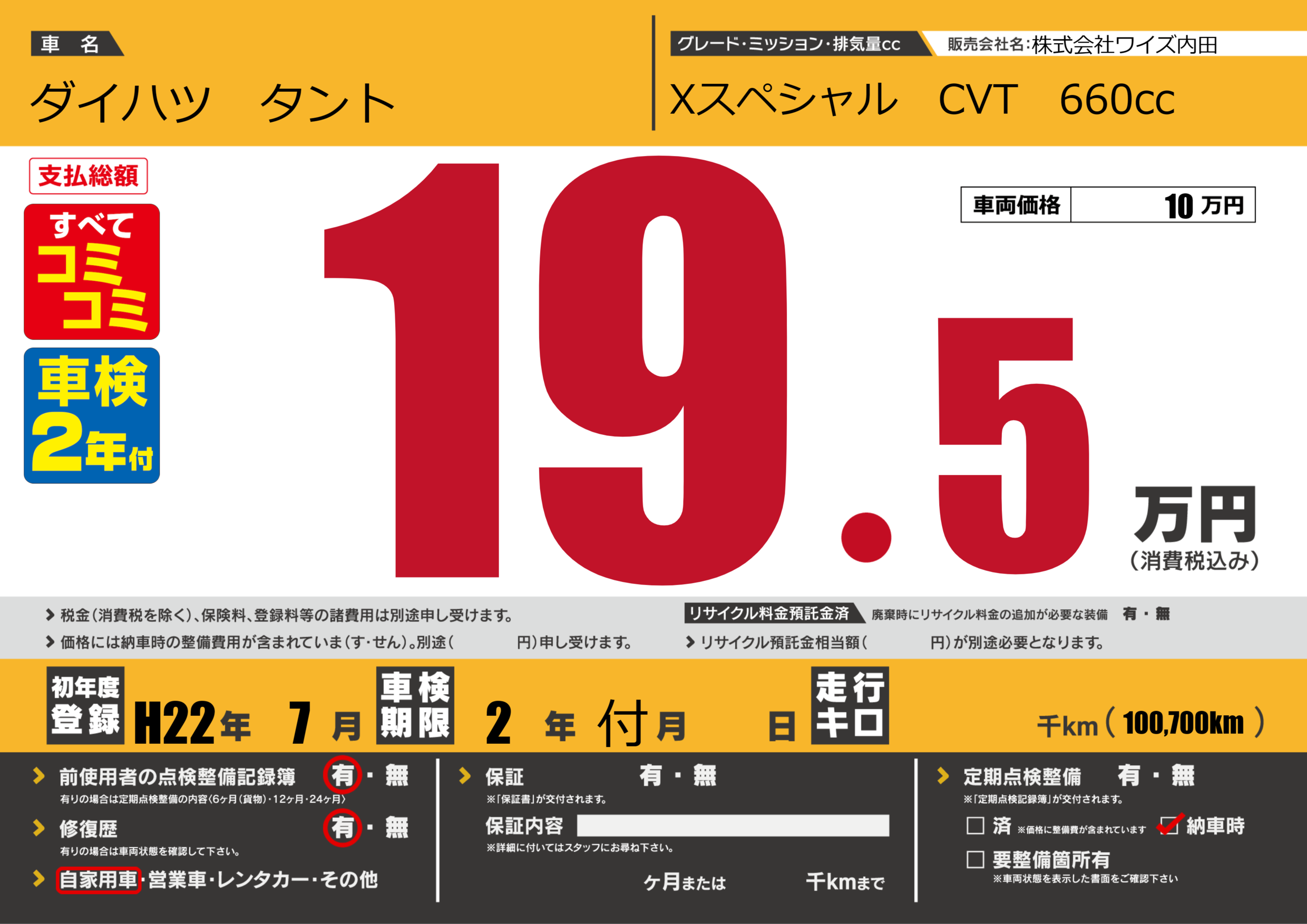 | 車名 | ダイハツ タント | グレード ミッション 排気量 |