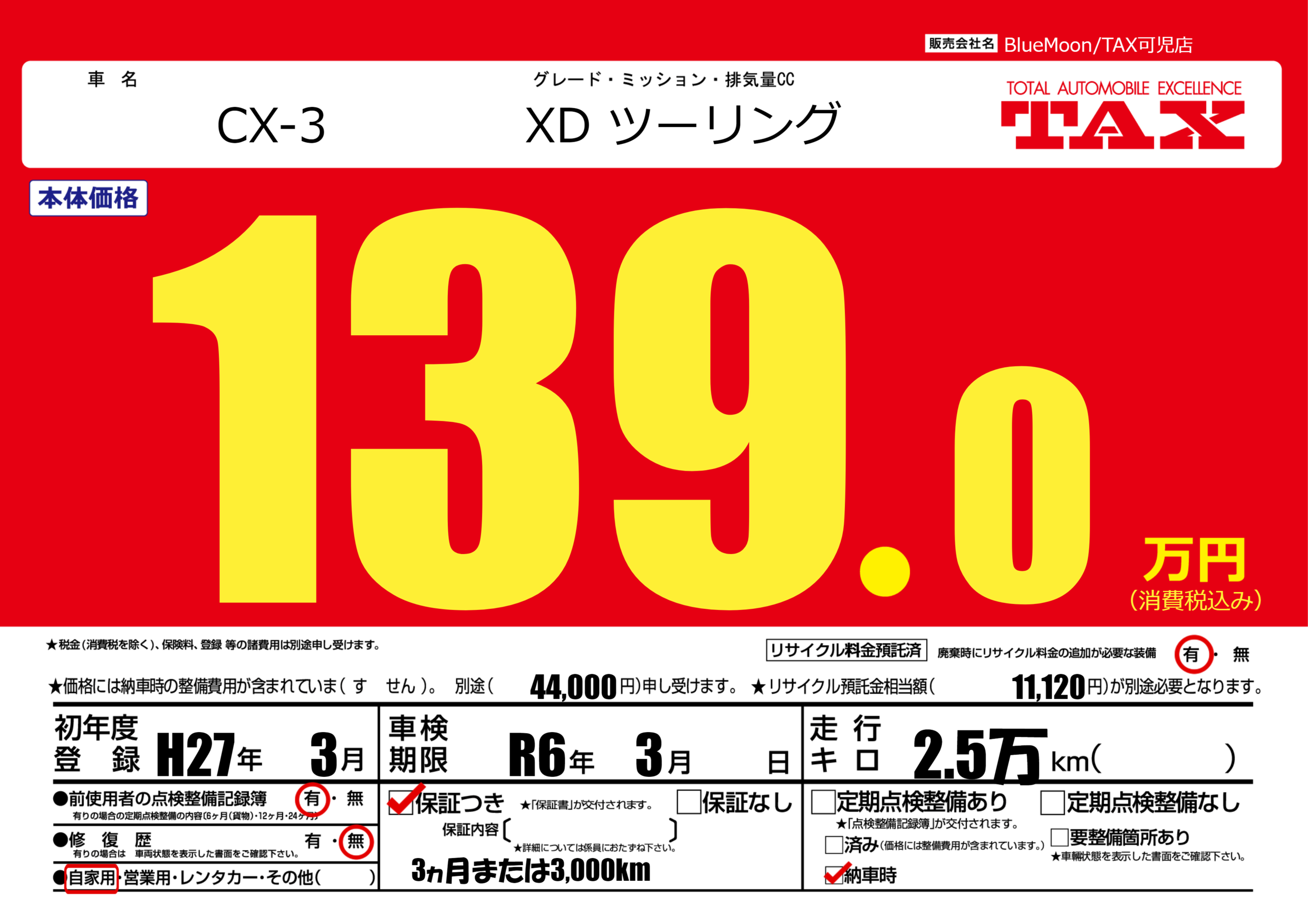 | 車名 | CX-3 | グレード ミッション 排気量 |
