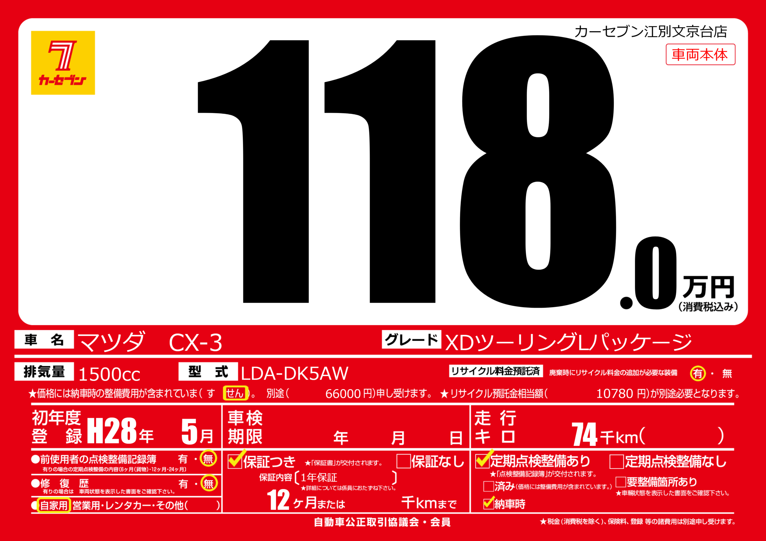 | 車名 | マツダ CX-3 | グレード ミッション 排気量 |