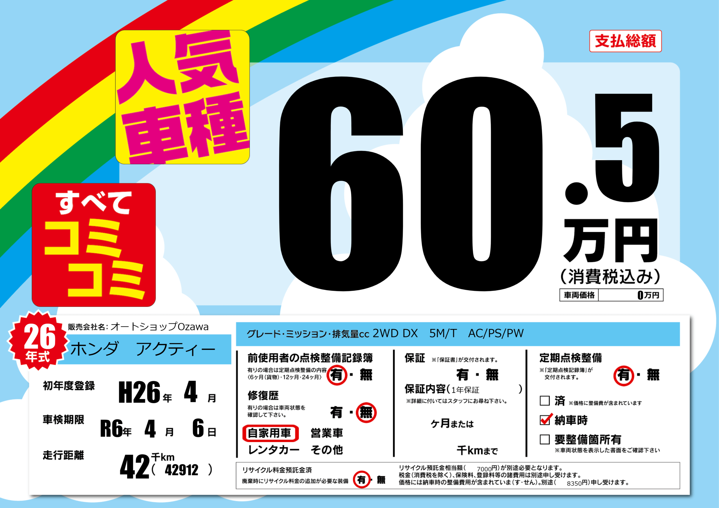 | 車名 | ホンダ アクティー | グレード ミッション 排気量 |