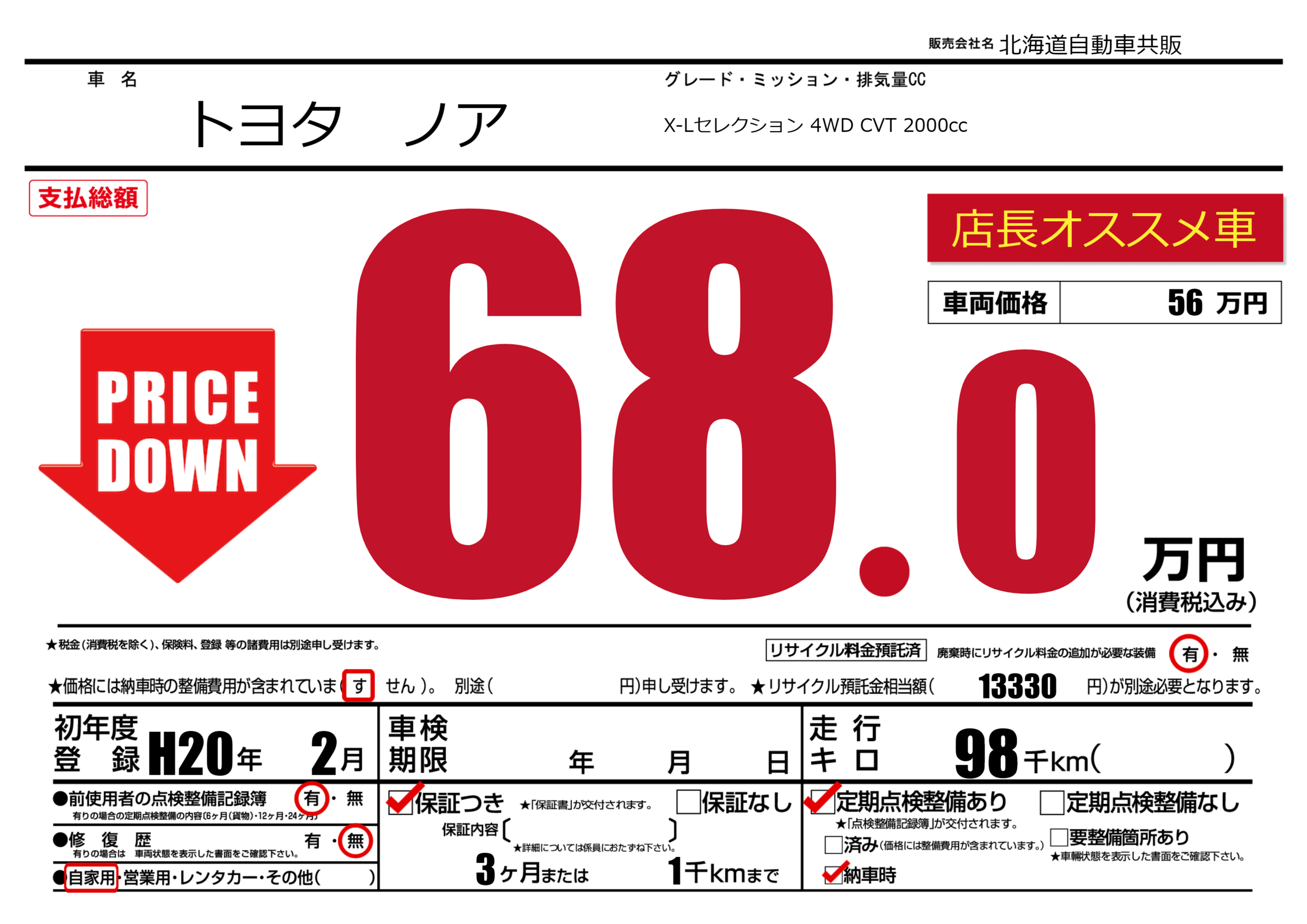 | 走行キロ | 9.8万km | 初年度登録 | H20年2月 |