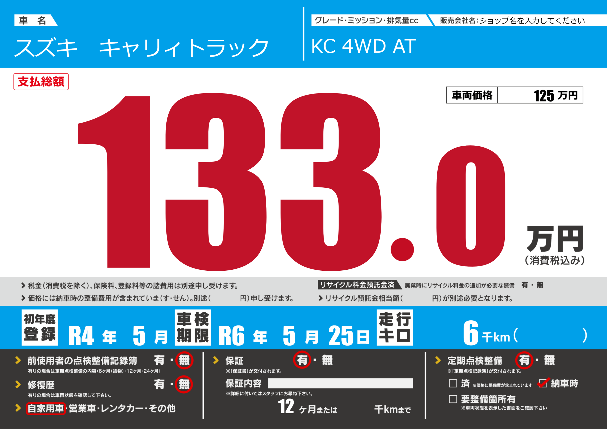 保証付き 保証内容(---) 12ヶ月または()千kmまで |