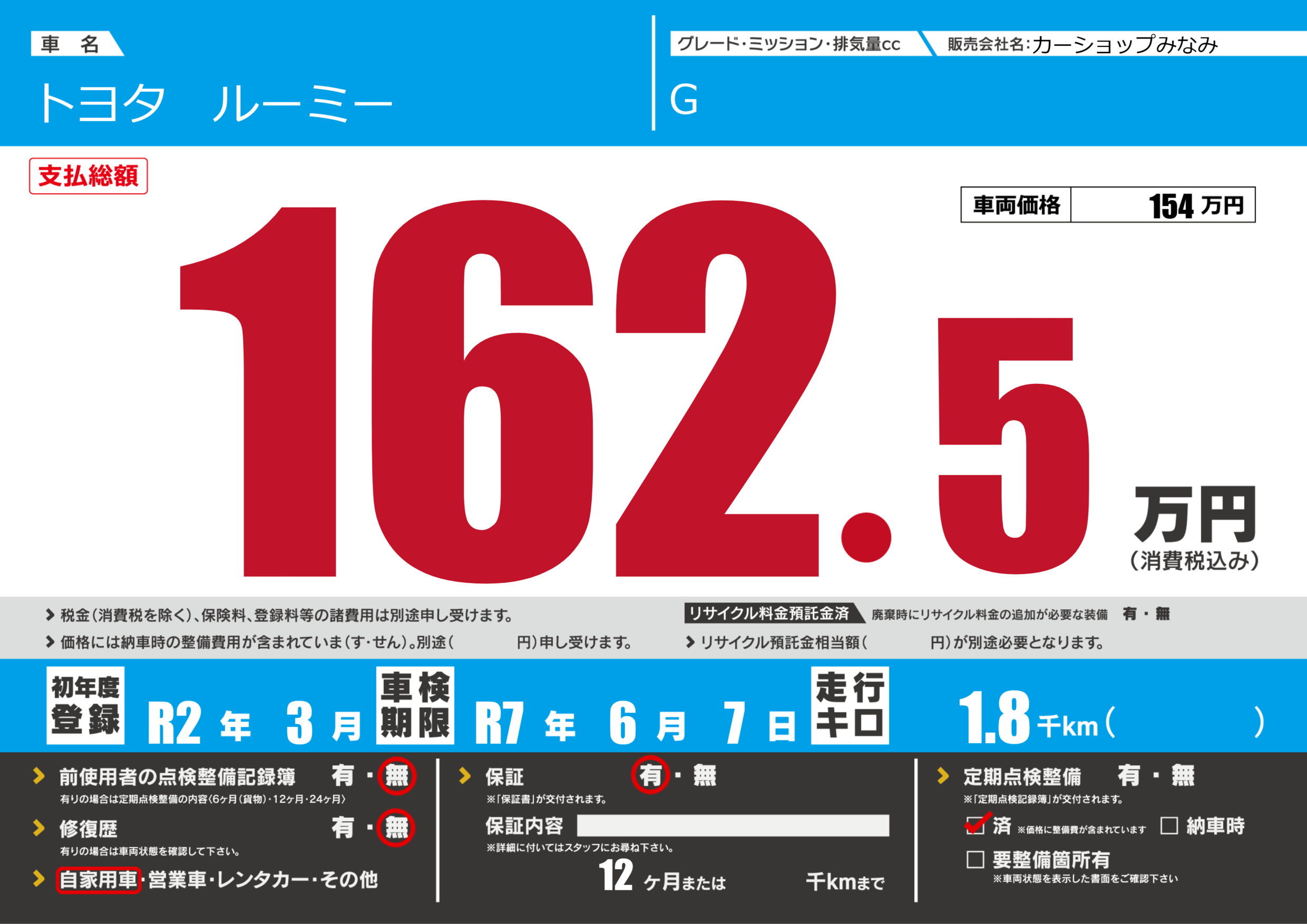 | 車名 | トヨタ ルーミー | グレード ミッション 排気量 |