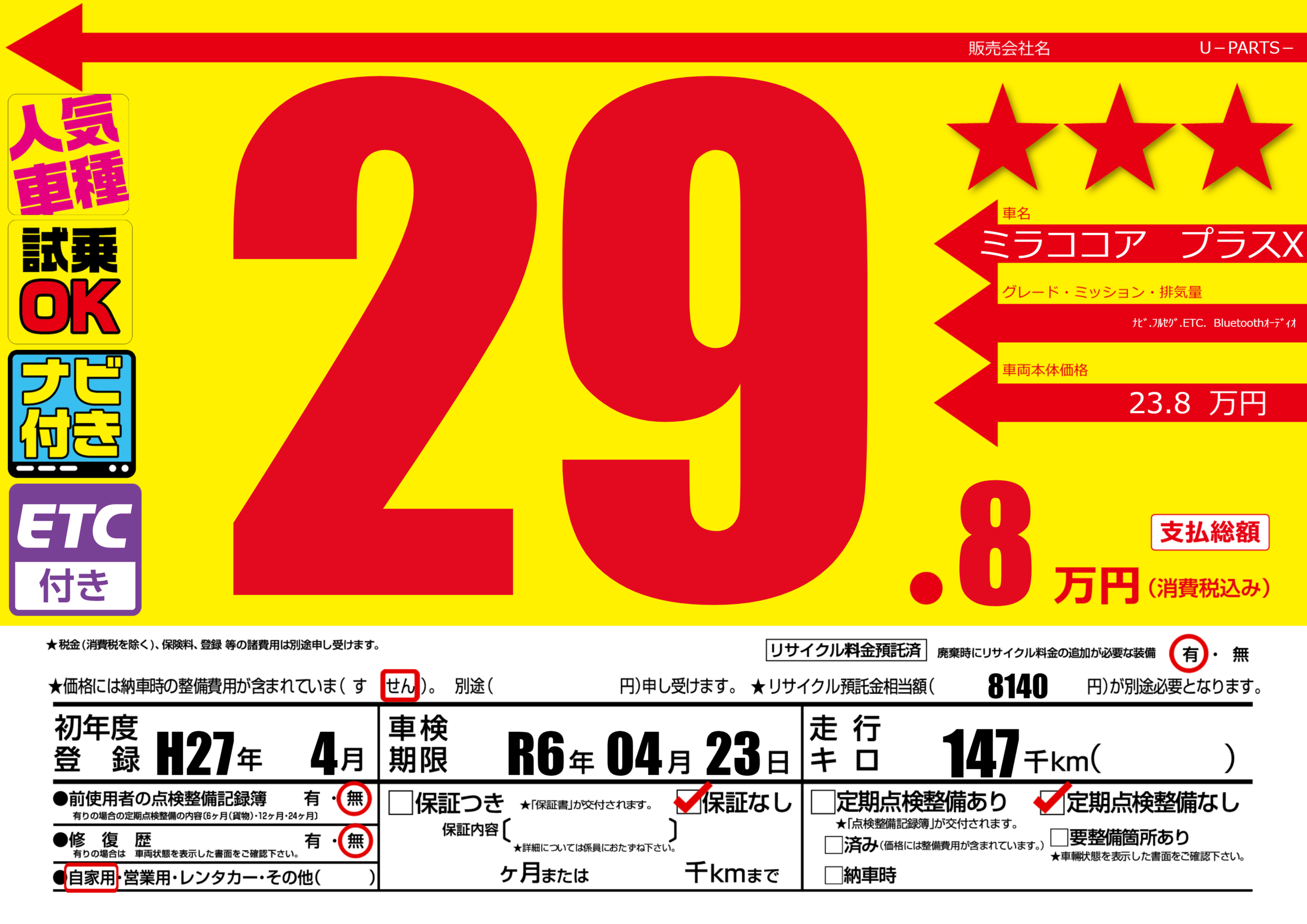 | 走行キロ | 14.7万km | 初年度登録 | H27年4月 |