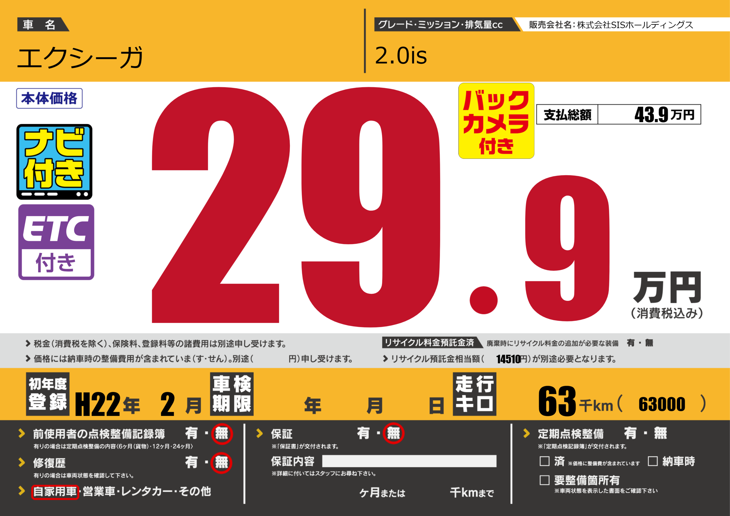 | 車名 | エクシーガ | グレード ミッション 排気量 |