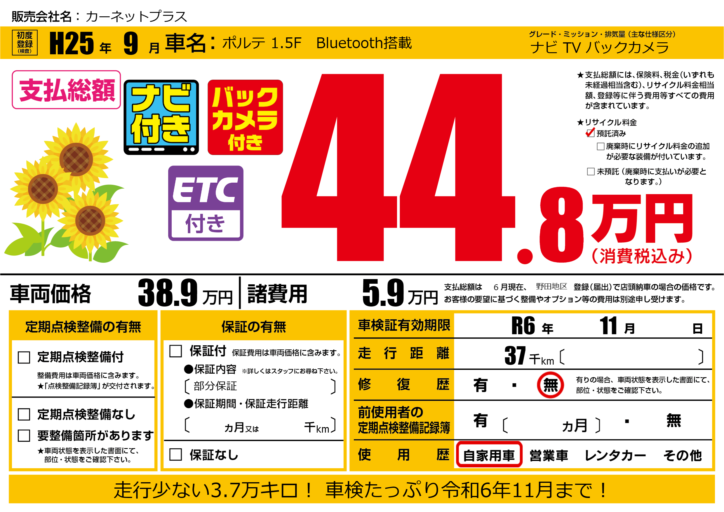 | 車名 | ポルテ 1.5F Bluetooth搭載 | グレード ミッション 排気量 |