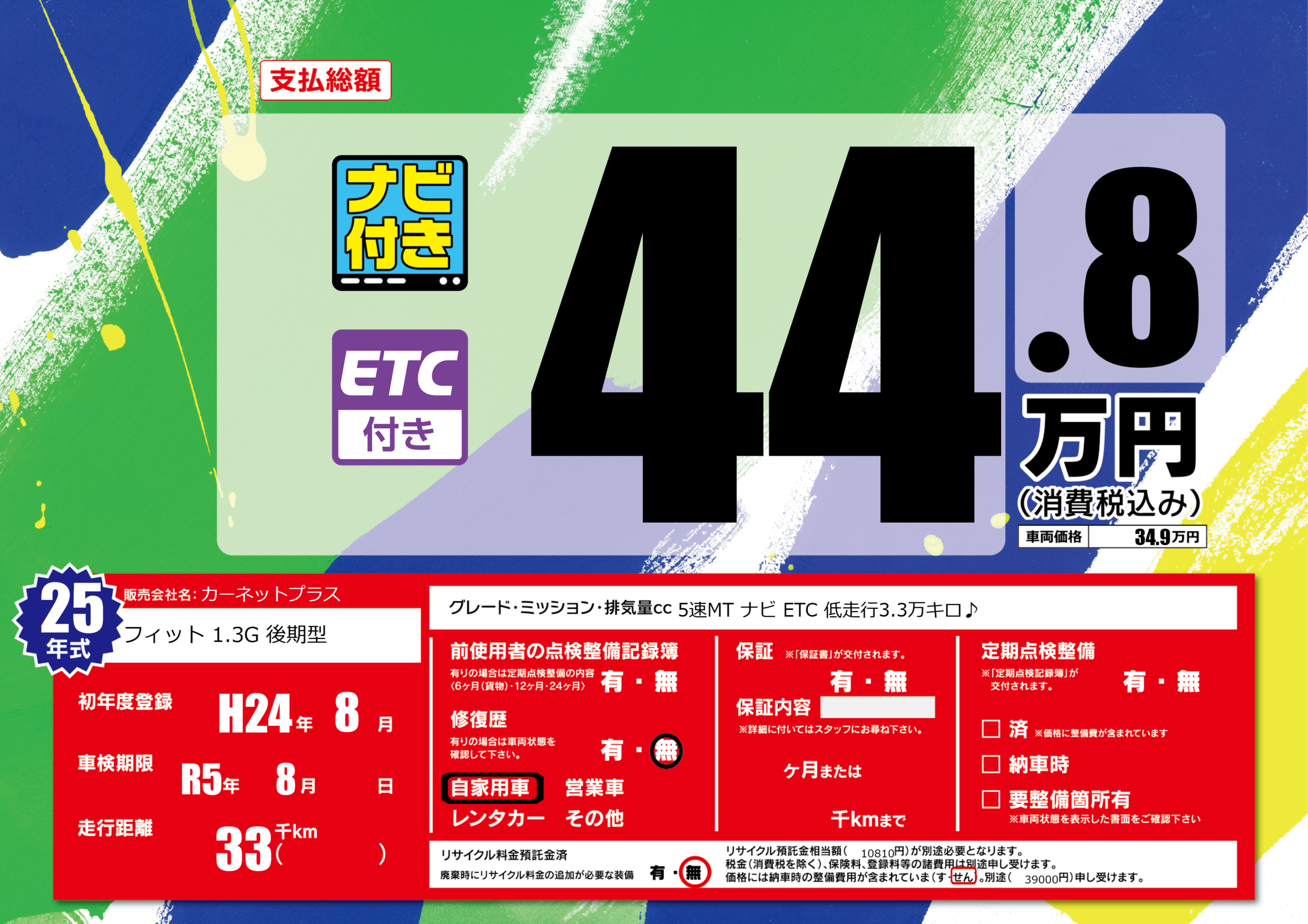 | 走行キロ | 3.3万km | 初年度登録 | H24年8月 |