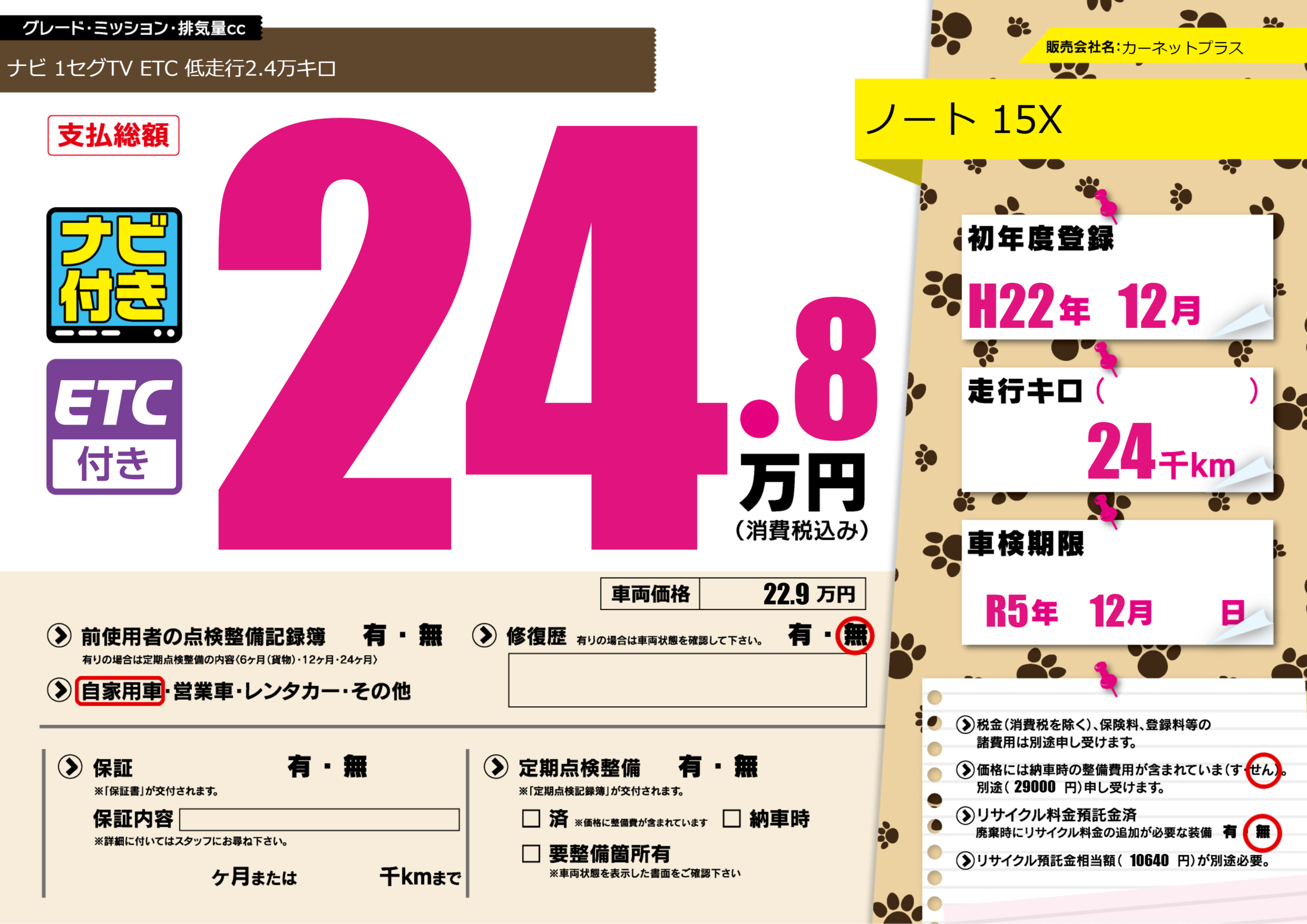 | 走行キロ | 2.4万km | 初年度登録 | H22年12月 |