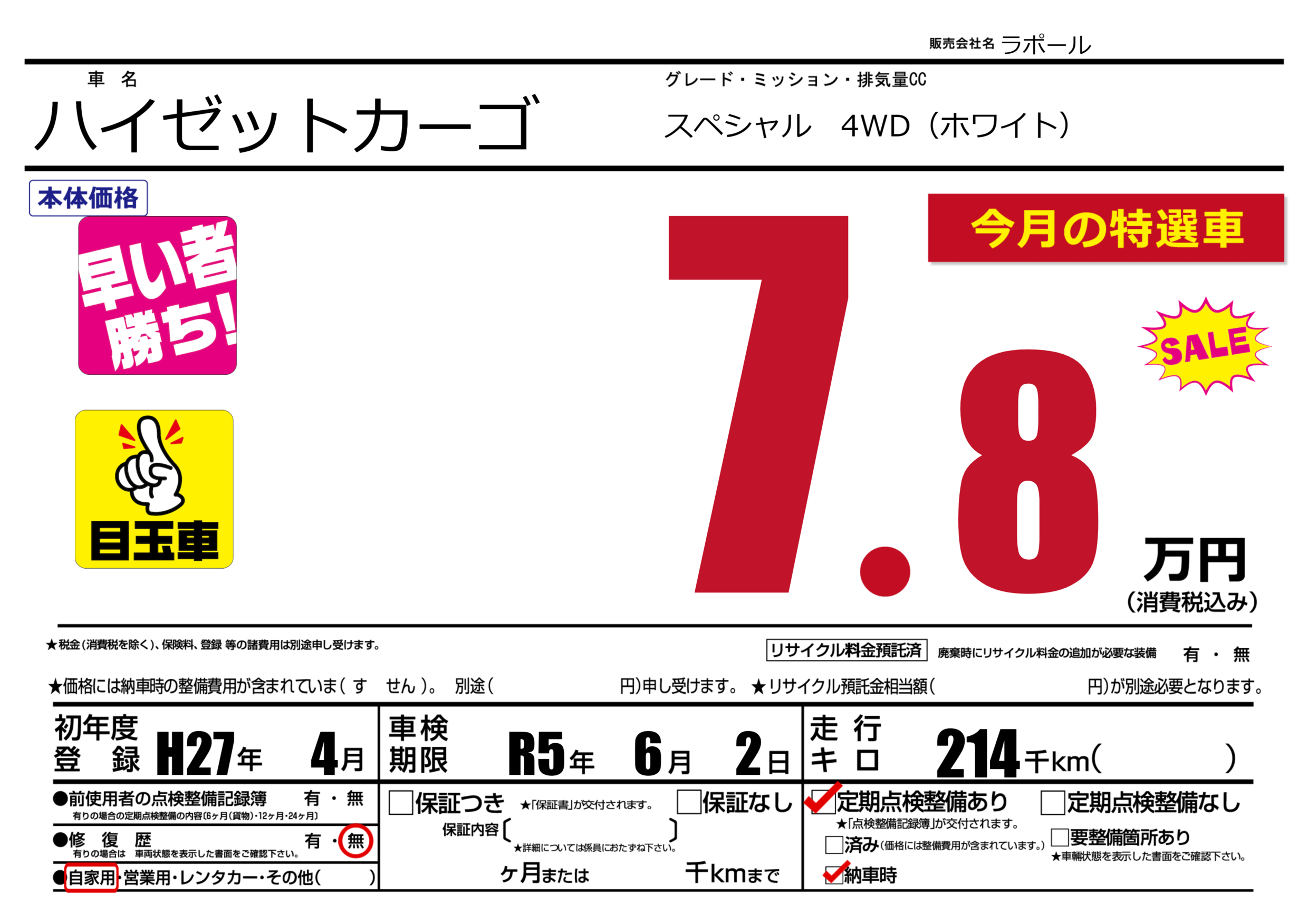 | 車名 | ハイゼットカーゴ | グレード ミッション 排気量 |